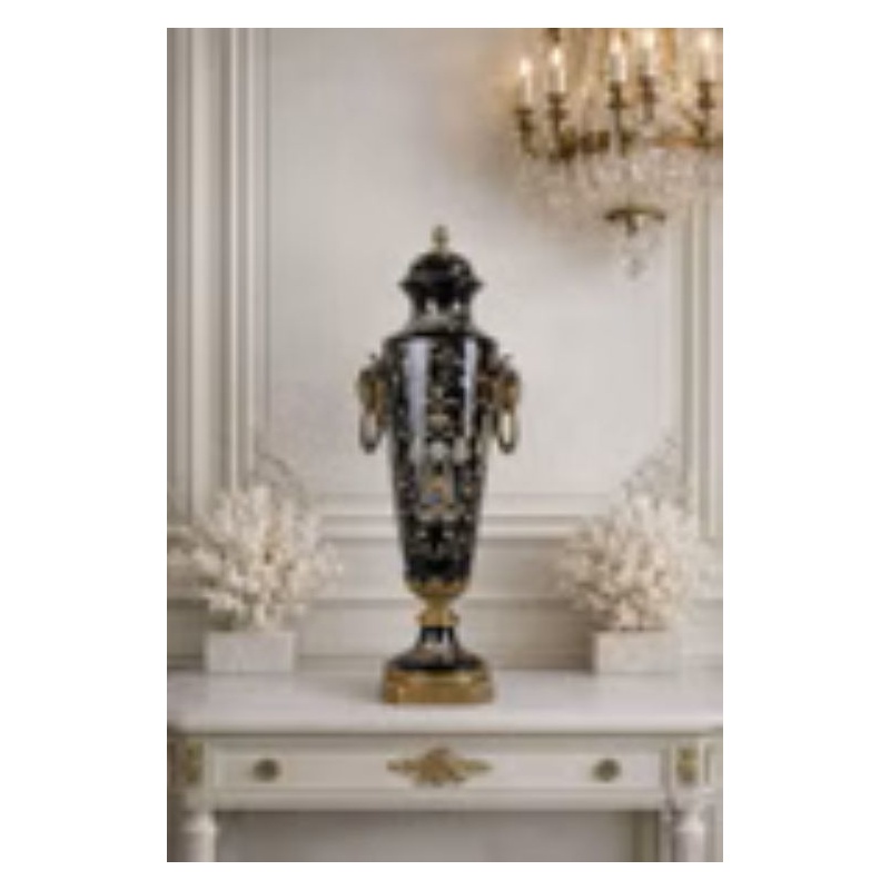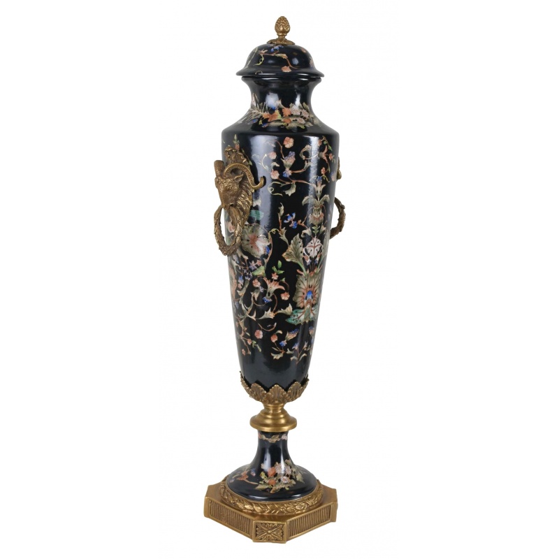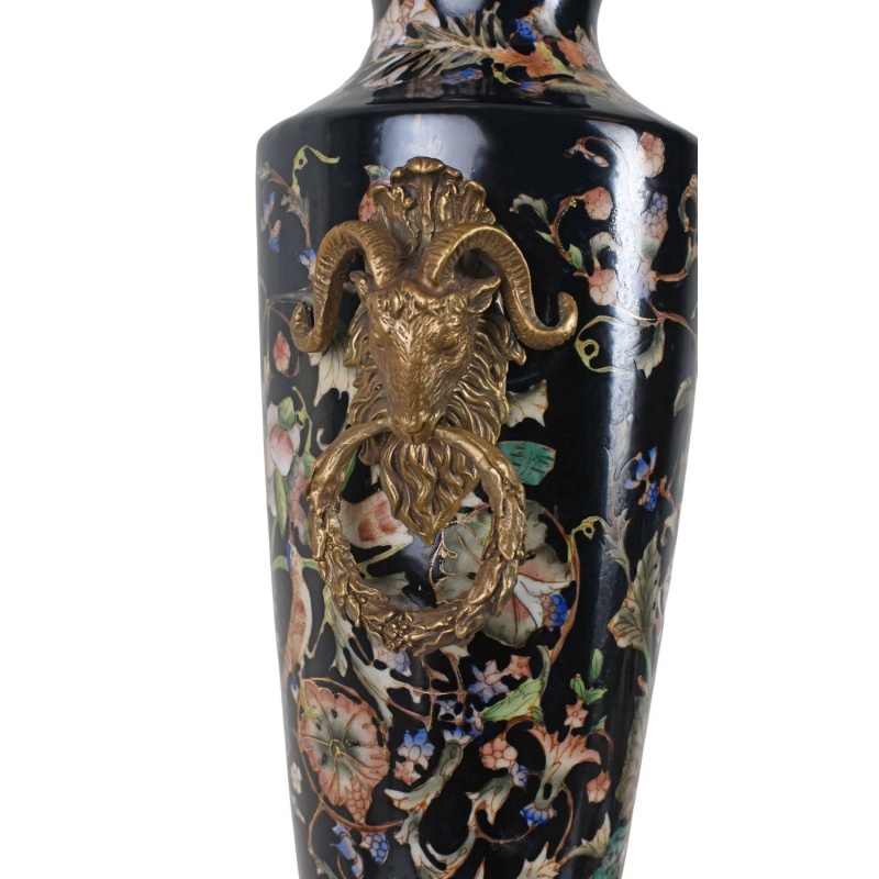 O impunatoare amfora realizata din portelan Craquelle negru, pictata manual cu elemente florale, cu soclu si decoratiuni sub forma unor capete de berbec din bronz masiv.