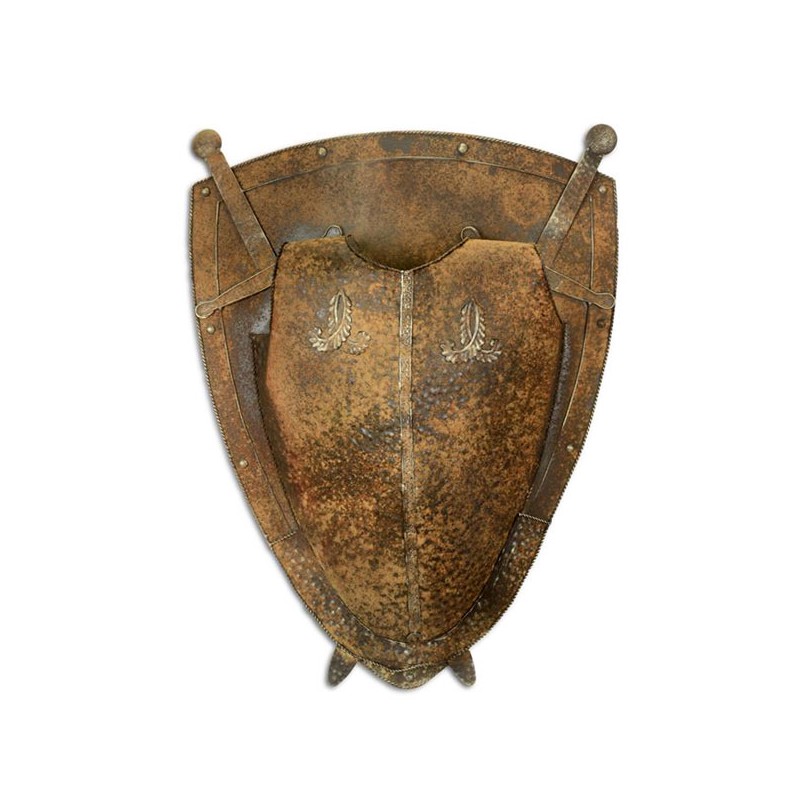 Un scut cu sabii din fier din fier forjat antichizat. Scutul este lucrat integral manual, poate fi folosit ca si décor sau poate constitui un frumos cadou pentru un domn deosebit.