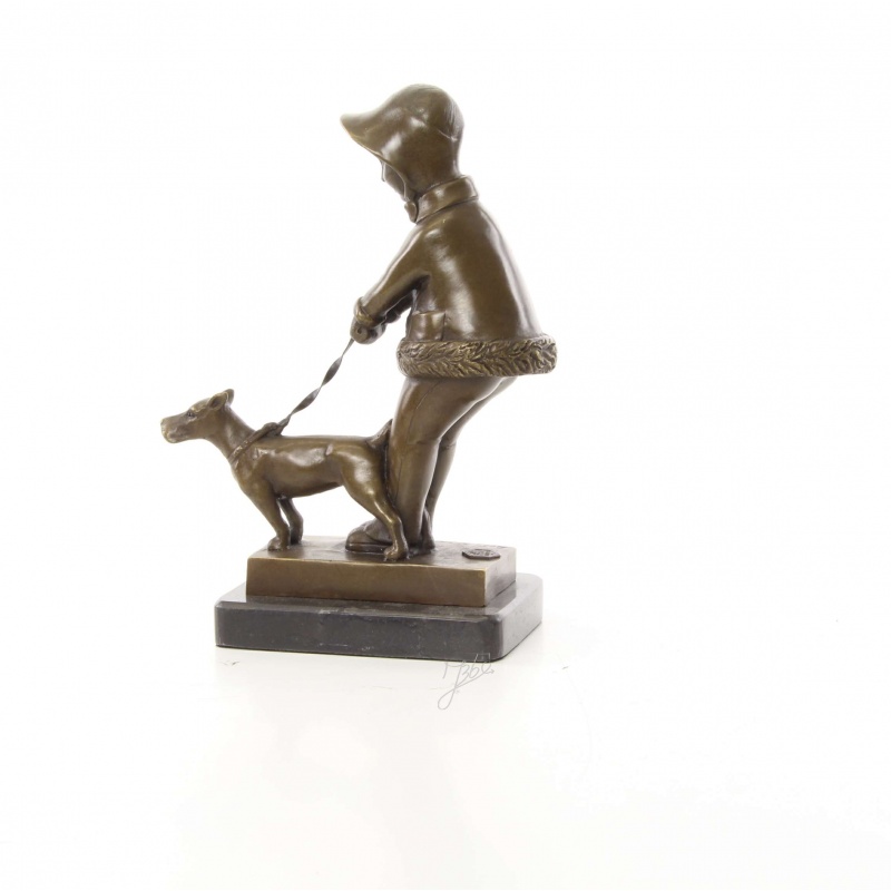 O frumoasa statueta Art Deco din bronz masiv, cu un soclu din marmura, ilustrand o fetita cu un catel.
