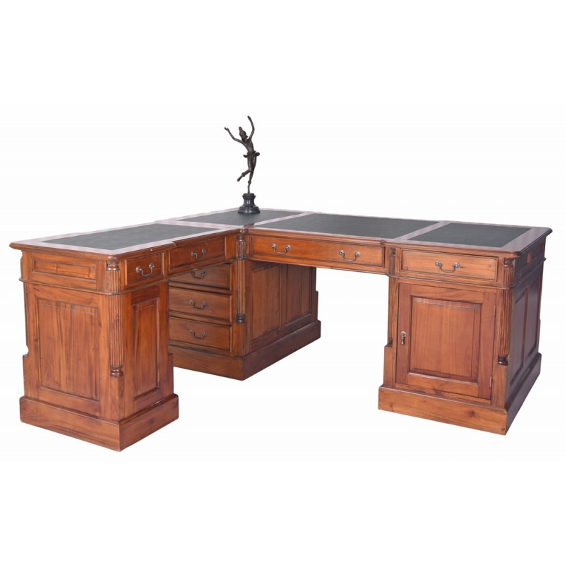 Un impunator birou englezesc de colt din lemn de mahon cu blat din piele ecologica.