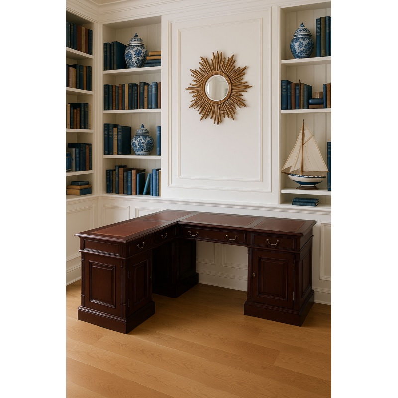 Birou englezesc de colt din lemn masiv mahon cu piele rosie