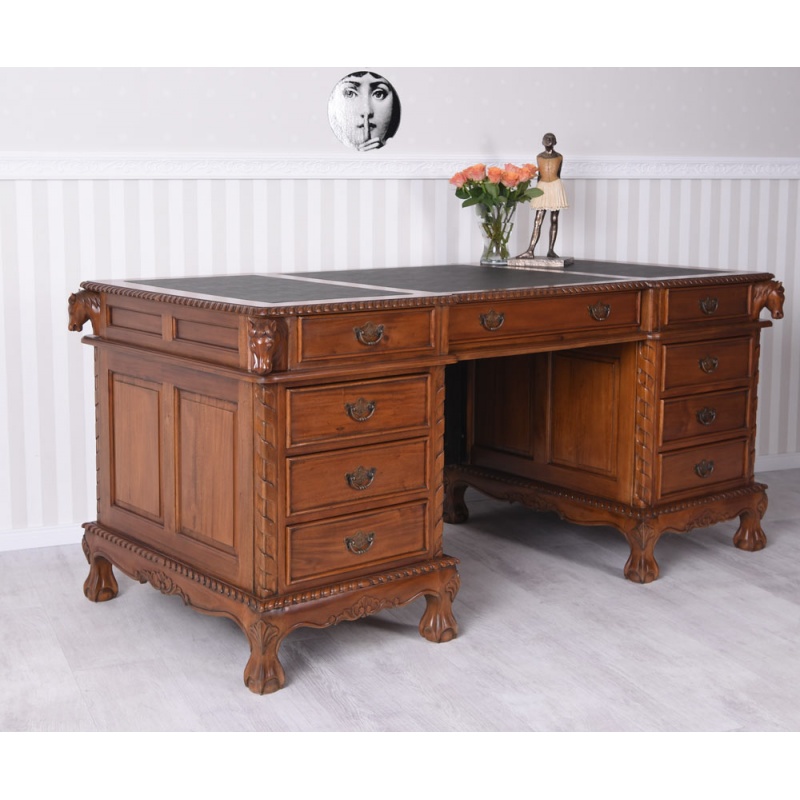 Un frumos birou englezesc din lemn masiv cu tapiterie neagra si decoratiuni cu capete de cal.