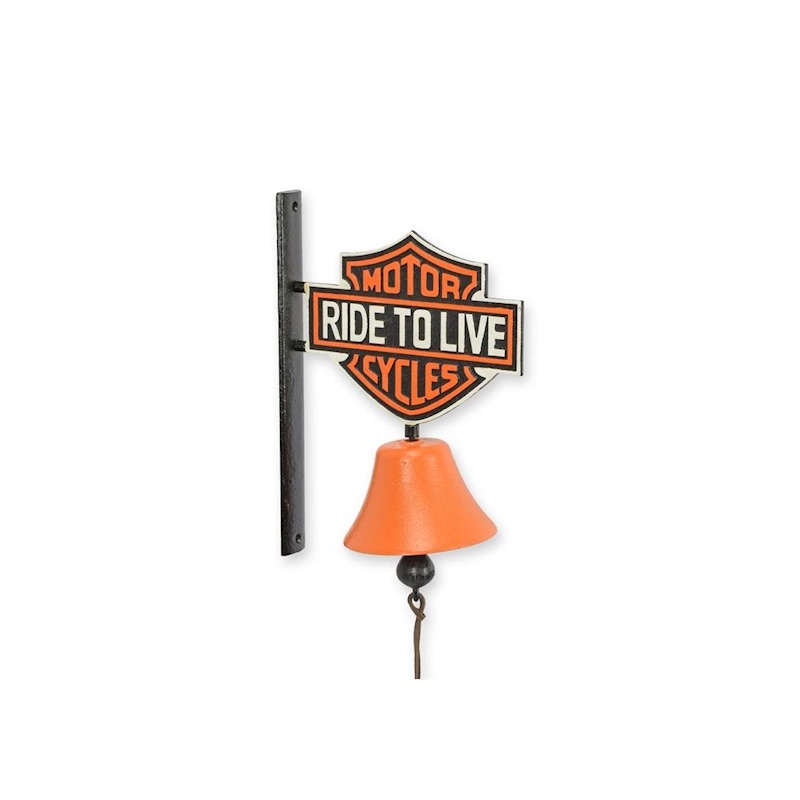 Un inedit clopot pentru usa din fonta masiva cu finisaj portocaliu, inscriptionat „RIDE TO LIVE”, un accesoriu decorativ cu tematica moto.