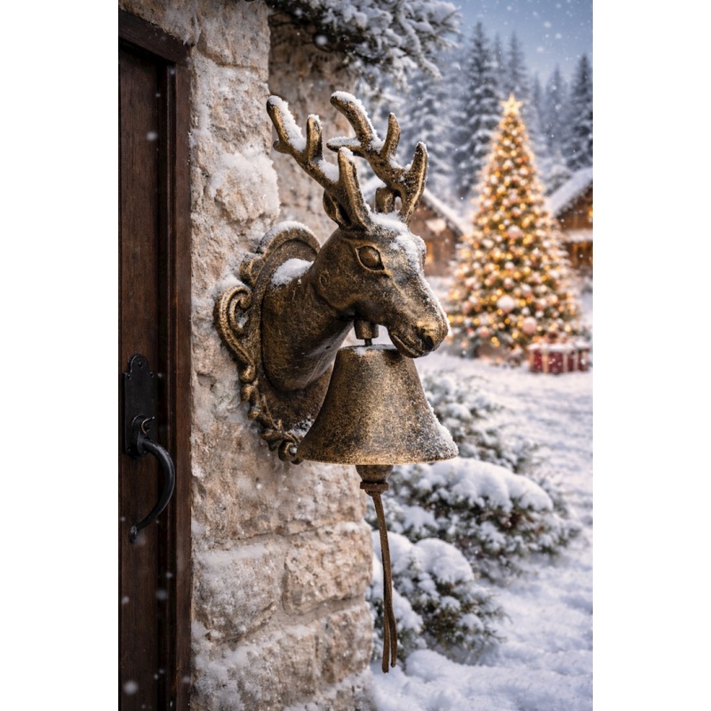 Un clopot decorativ din fonta pentru usa, cu design „cap de cerb”, ce imbina robustetea materialului cu un stil rustic elegant.