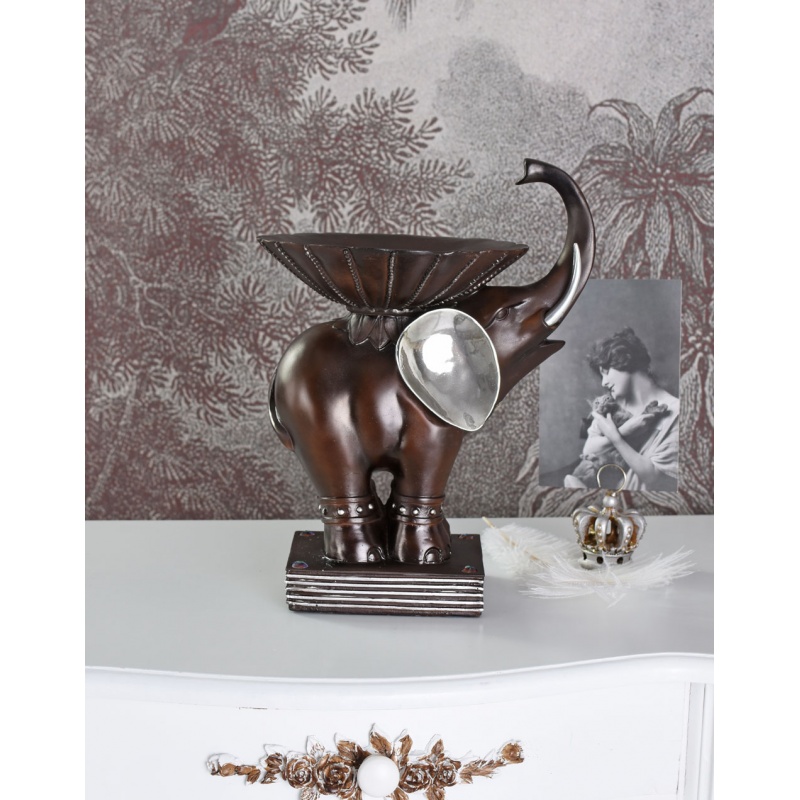O frumoasa fructiera din rasini sub forma de elefant cu finisaj argintiu.
