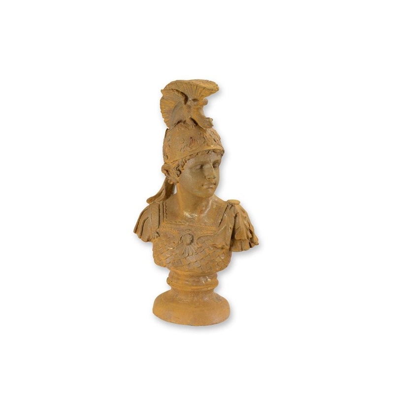 Un bust din fontă ruginie a unui legionar roman, ce conferă o notă de autenticitate și caracter vintage unei incaperi.