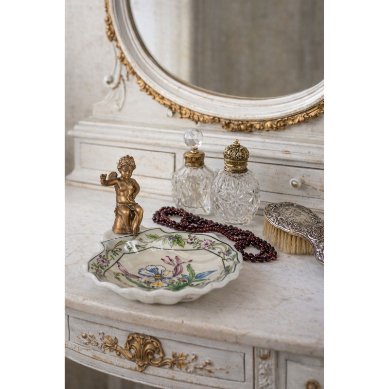 O savoniera din portelan Craquelle, pictata manual, cu picioruse si decoratiune sub forma unui ingeras din bronz masiv.