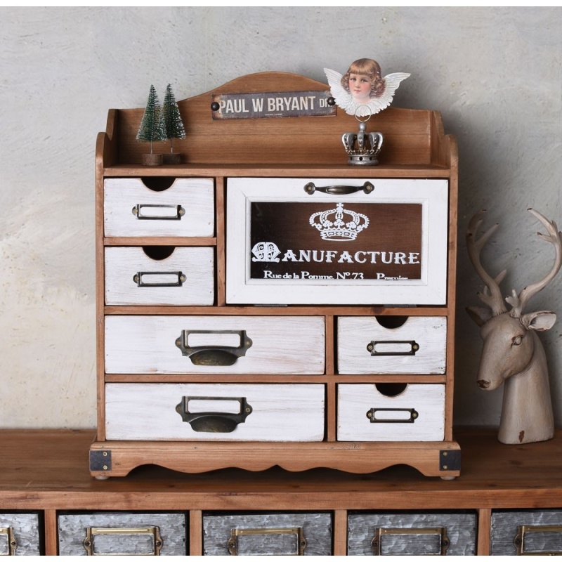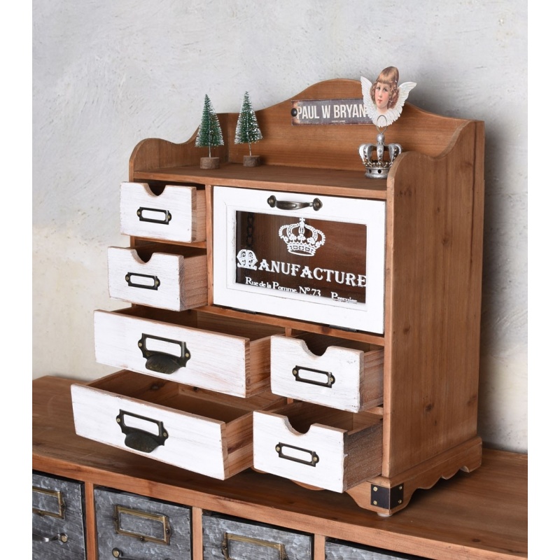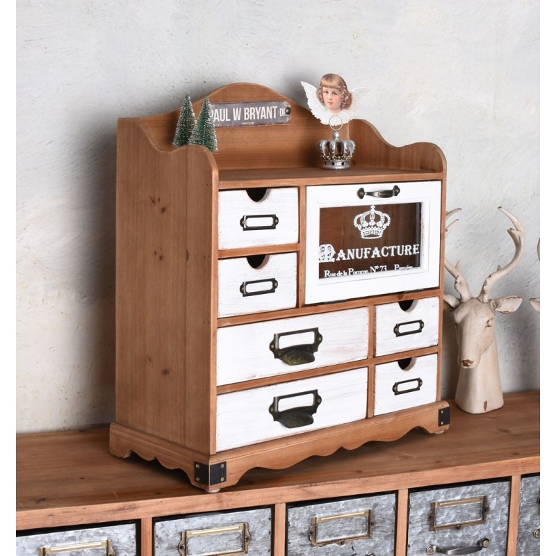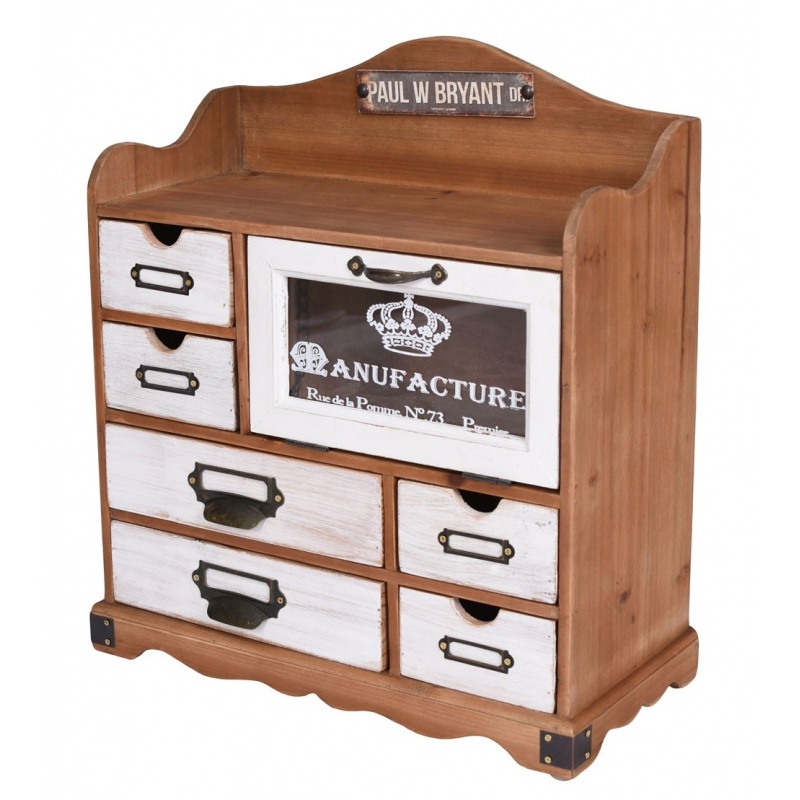 Un dulapior cu sticla din lemn masiv maro, cu sase sertare.