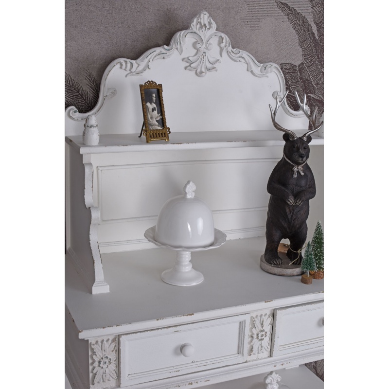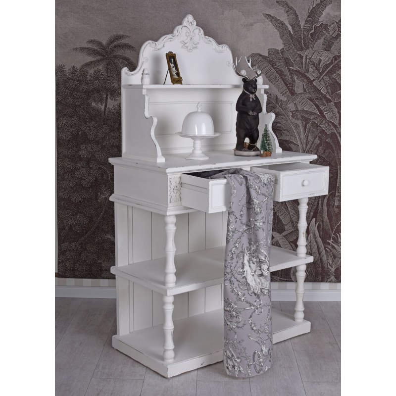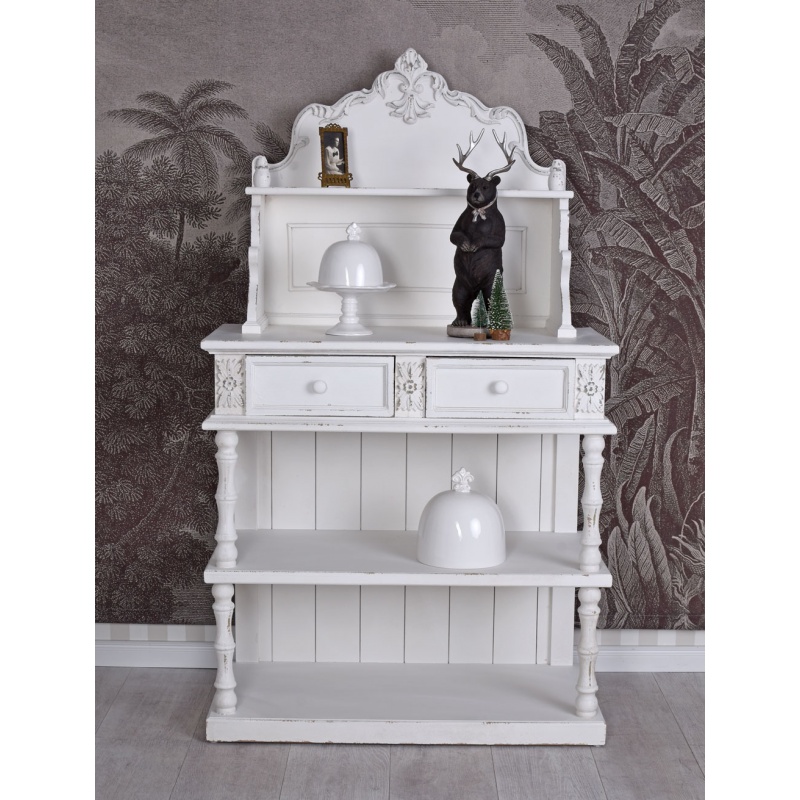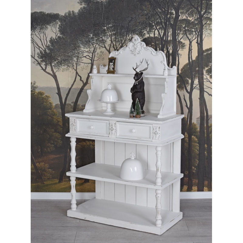 Un bufet din lemn masiv alb antichizat, o piesa deosebita ce are si loc de depozitare deschis, dar si 2 sertare.