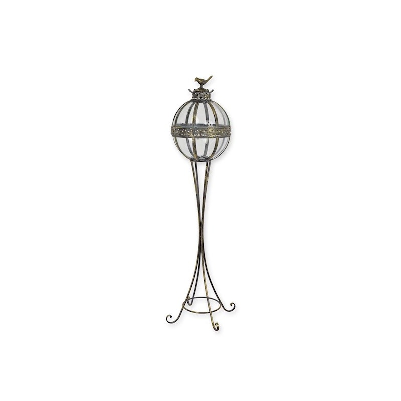 Un impozant felinar pentru podea din metal argintiu antichizat si glob din sticla transparenta.