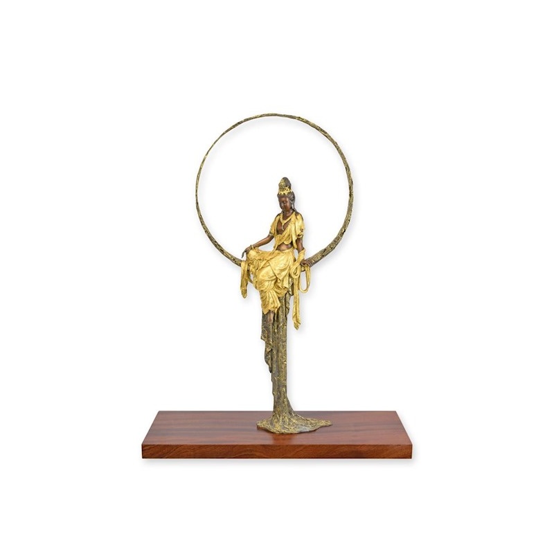 O monumentala statueta din bronz masiv cu un soclu dreptungiular intitulata"Guanyn sezand", ce ilustreaza o doamna asezata pe piedestal.