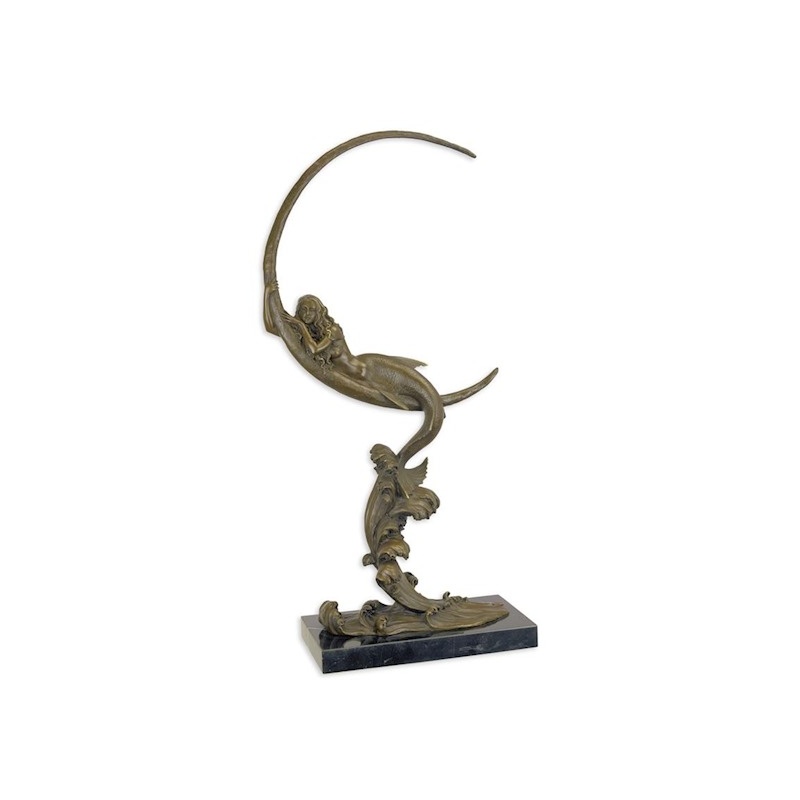 O frumoasa statueta moderna din bronz masiv pe un soclu din marmura ilustrand o sirena cu luna.