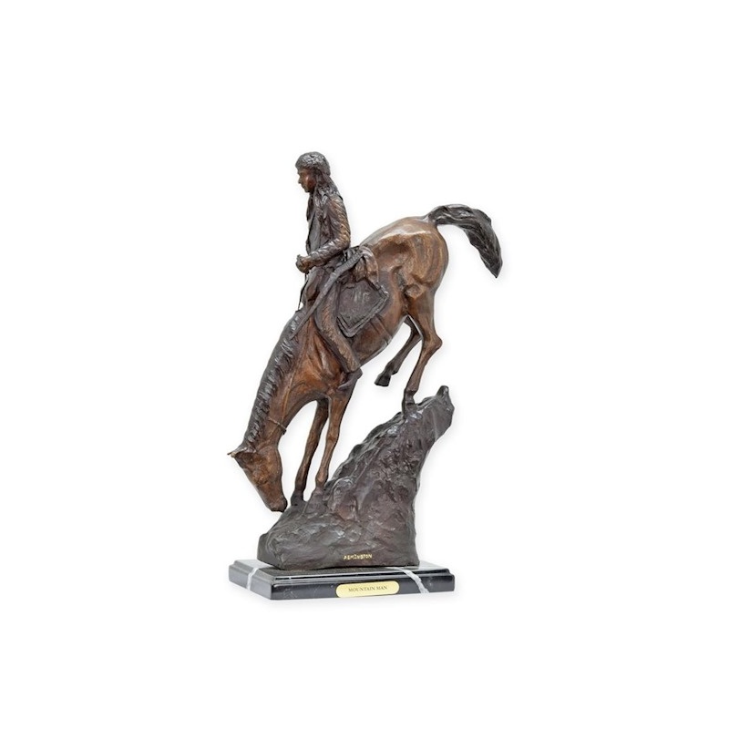 O statueta din bronz masiv cu un soclu din marmura neagra, ilustrand un om al muntilor cu un cal.