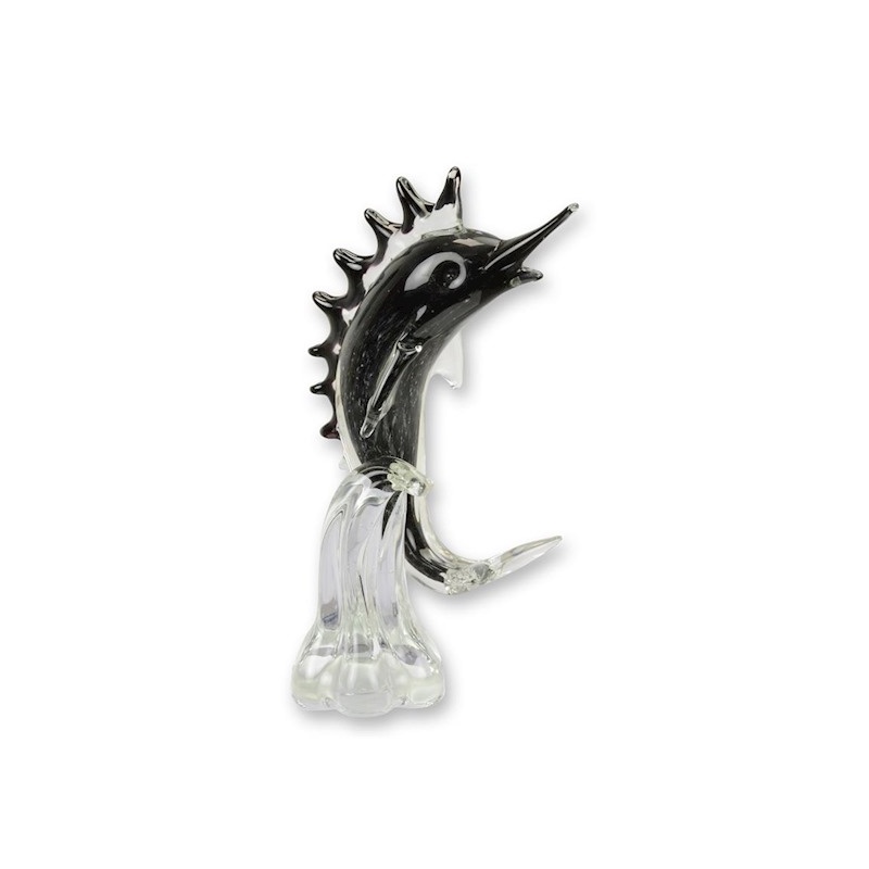O figurină din sticlă, realizată în stilul distinctiv Murano,ce înfățișează un marlin.