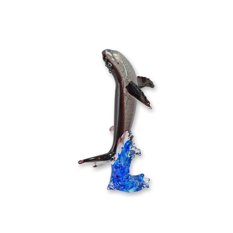 O figurina din sticla Murano, care reprezinta o balena, redusa intr-o maniera stilizata, cu linii curbe si un aspect elegant.