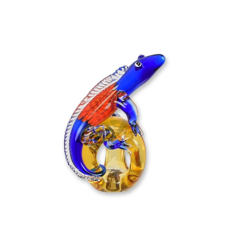 O figurina suflata si pictata manual, din sticla Murano, care infatiseaza o soparla, redusa intr-o maniera stilizata.