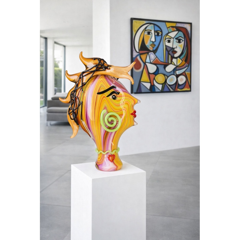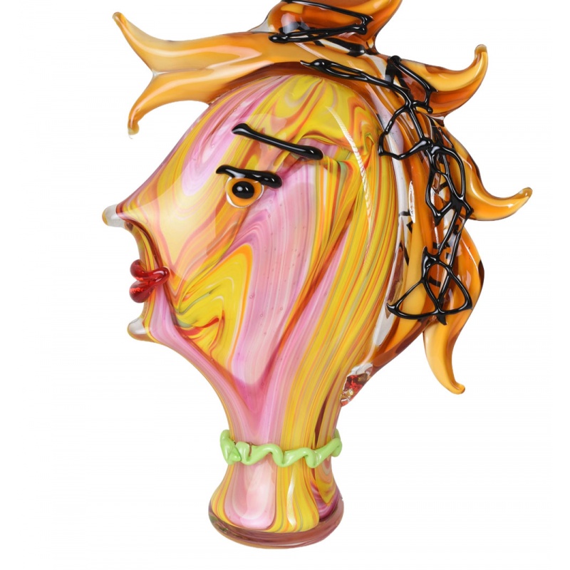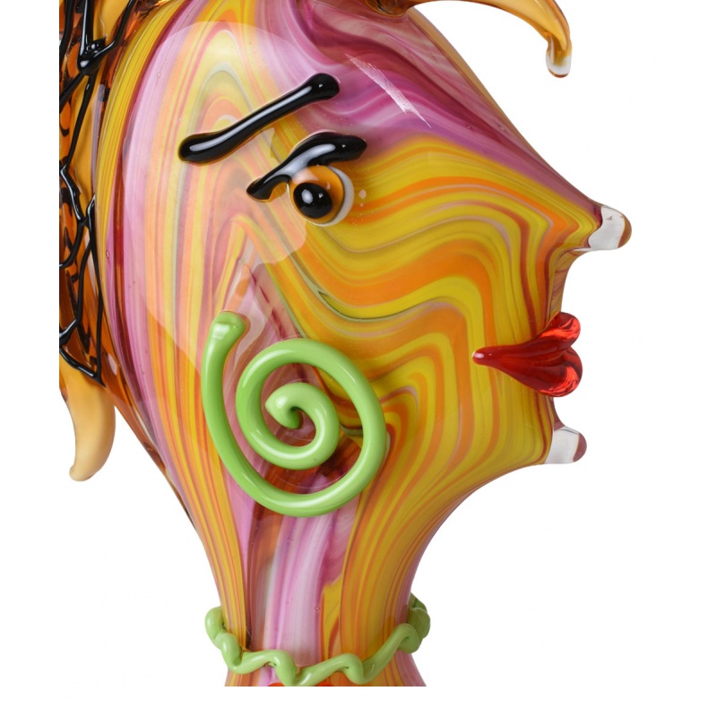 O figurina impunatoare, realizata in stil Murano, care reprezinta capul unei femei, stilizat intr-o forma moderna, cu linii fluide si culori vibrante.