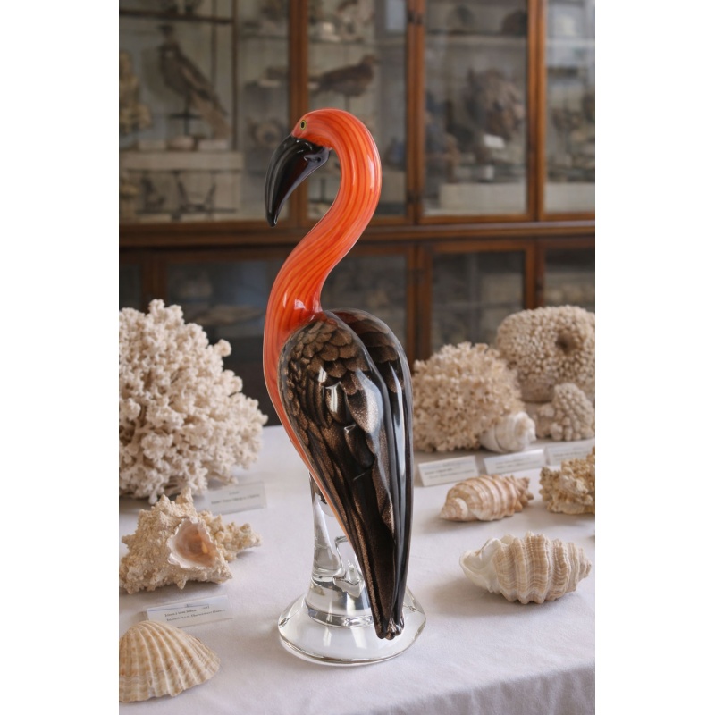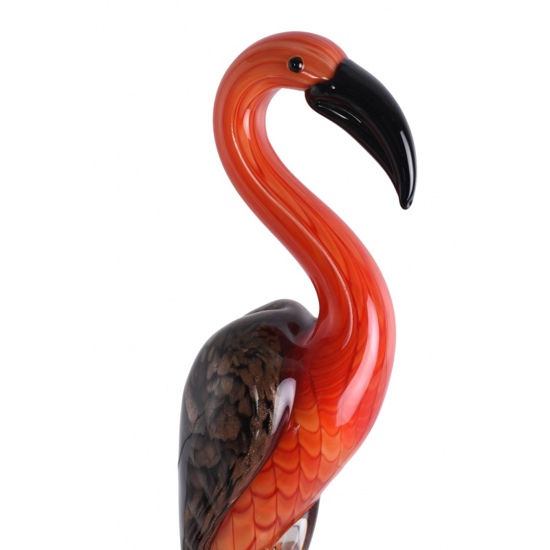O figurina eleganta, realizata din sticla suflata si colorata manual, in stil Murano, care infatiseaza un flamingo rosu.