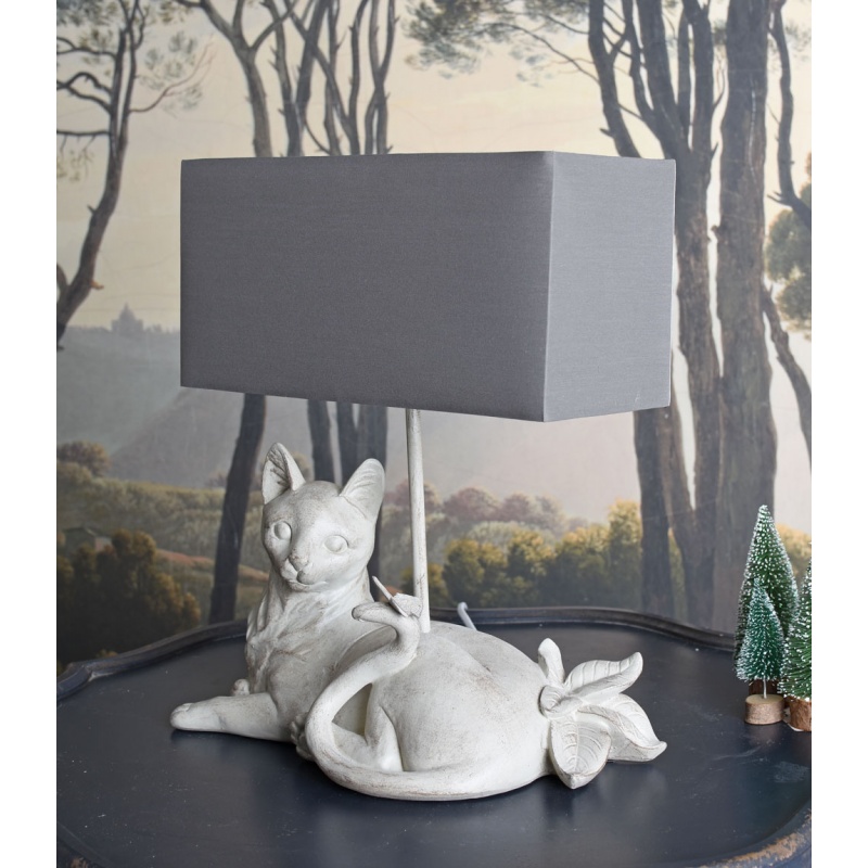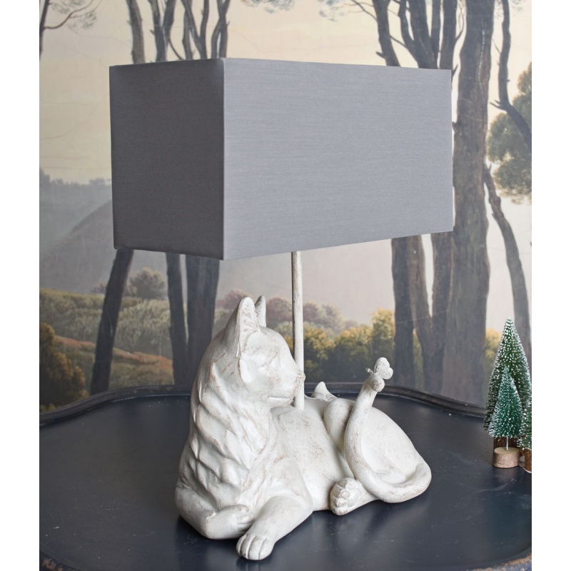 O lampa cu o pisica alba din polystein(amestec de rasini) pentru pus pe masa cu abajur din material textil, o piesa foarte frumoasa de pus intr-o camera.