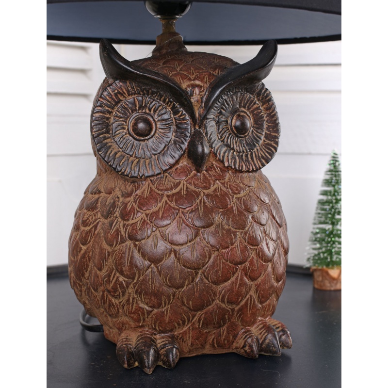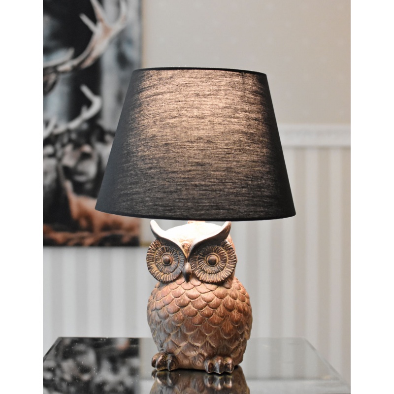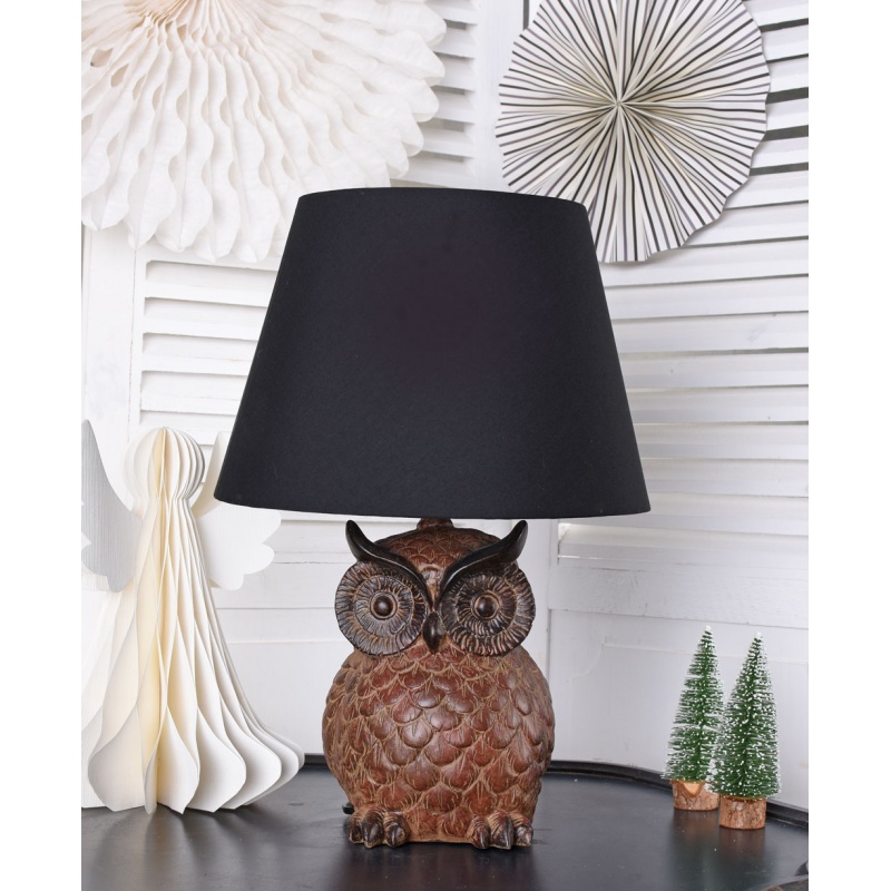 O lampa cu o bufnita din polystein(amestec de rasini) pentru pus pe masa cu abajur din material textil, o piesa foarte frumoasa de pus intr-o camera.