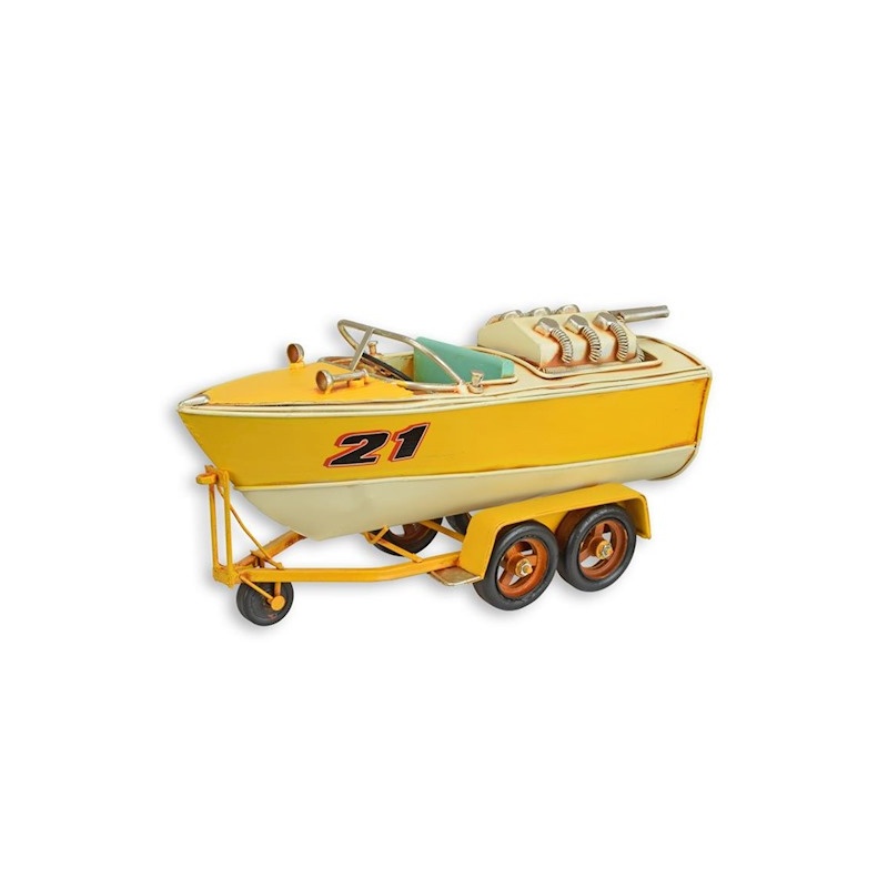 Un model din metal antichizat al unei barci de viteza asezata pe o remorca, o piesa decorativa nostalgica, realizata si pictata integral manual.