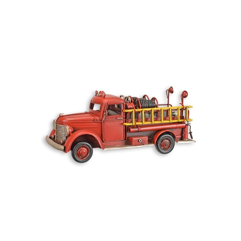 Un model miniatural confectionat din metal, al unei masini de pompieri, un vehicul emblematic al interventiilor de urgenta, recunoscut pentru culoarea sa rosie aprinsa si accesoriile specifice.