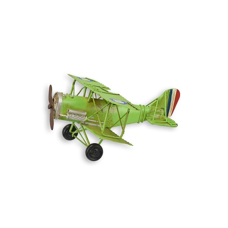 Un model din metal al unui biplan clasic, un design emblematic al aviatiei care include doua seturi de aripi, plasate una deasupra celeilalte.
