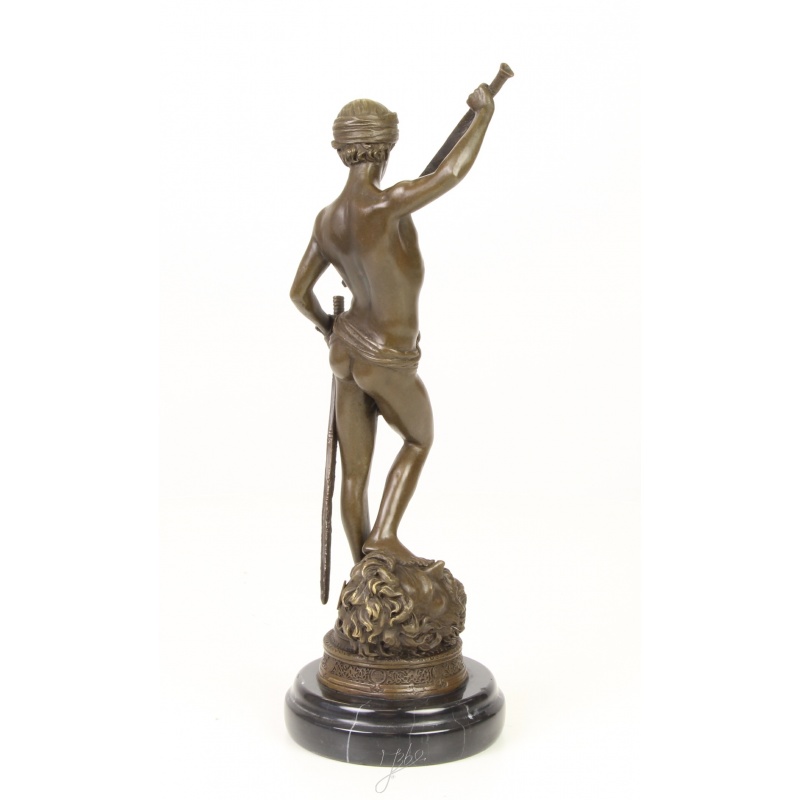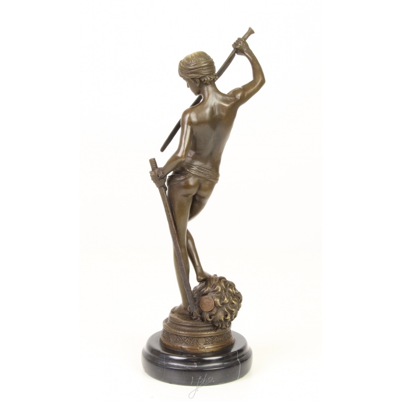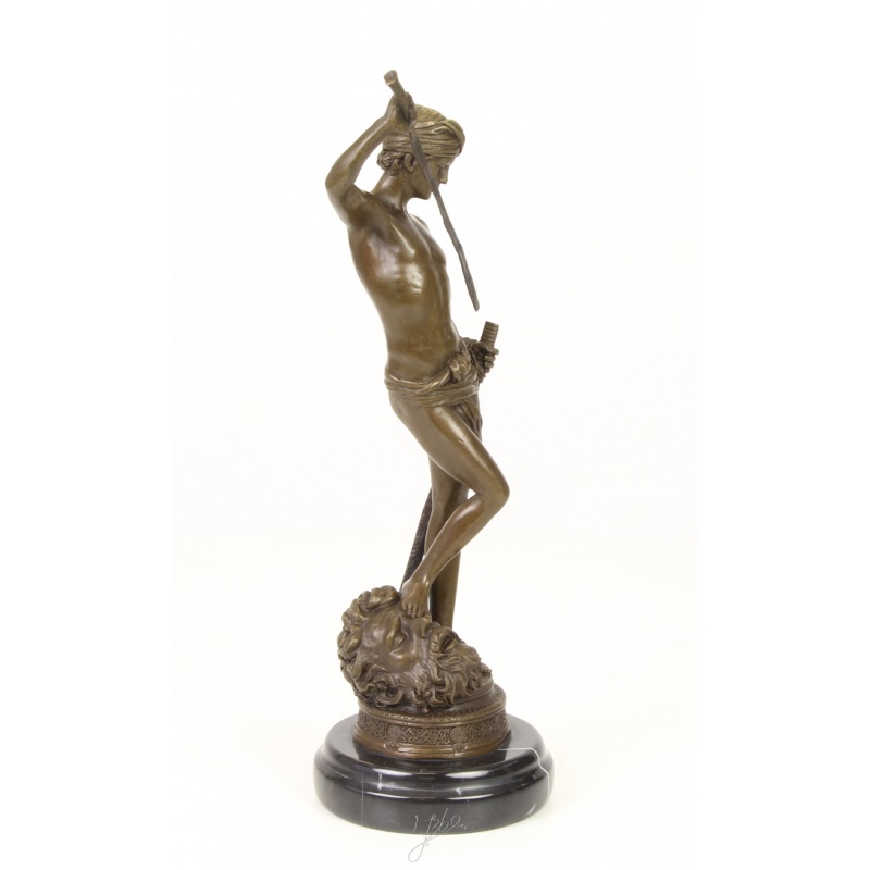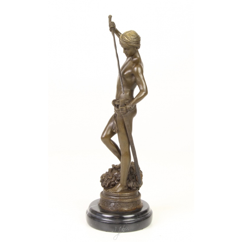 O frumoasa statueta din bronz pe un soclu din marmura, ilustrandu-l pe David dupa ce l-a invins pe Goliat.