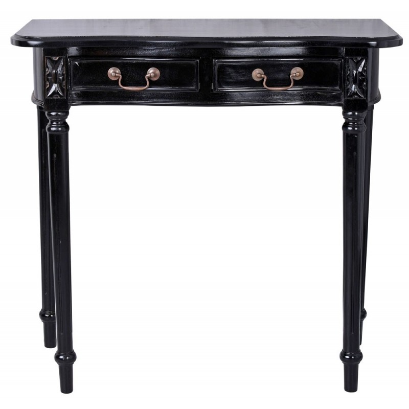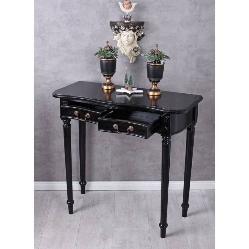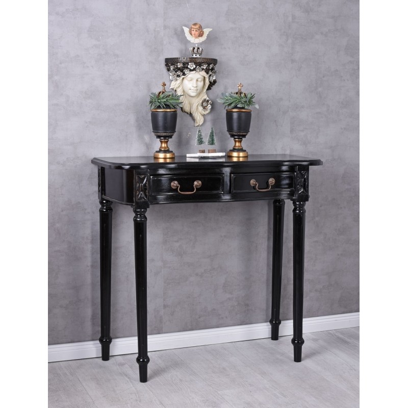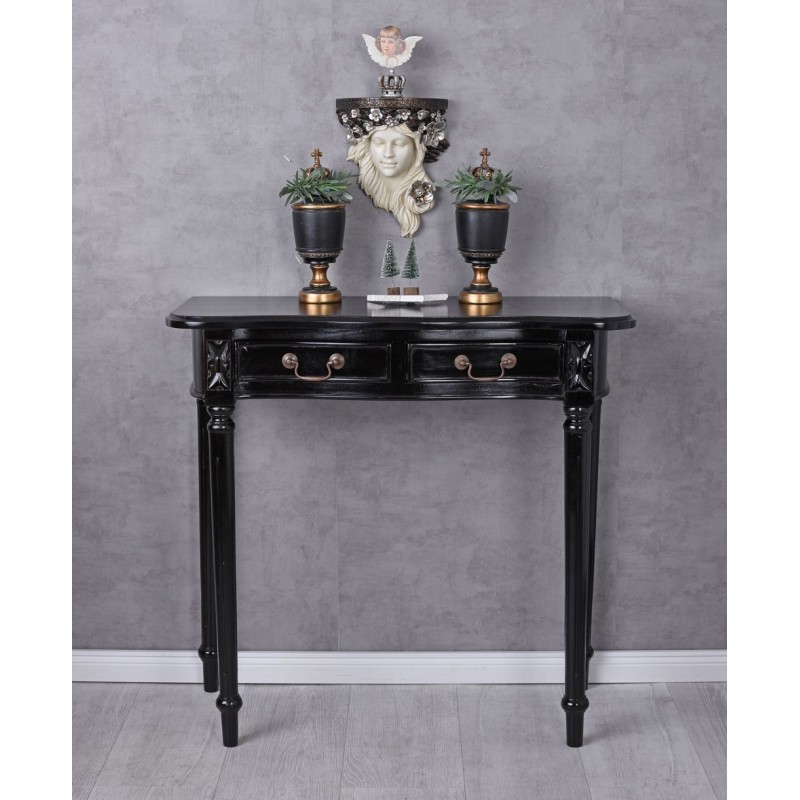 O consola din lemn masiv negru cu doua sertare si patru picioare.Este o piesa integral lucrata manual si e un aer de noblete deosebit. Consola este o piesa clasica, foarte solida si impunatoare, potrivita pentru mobilarea unui living. Dimensiuni: 74*79*34 cm;
