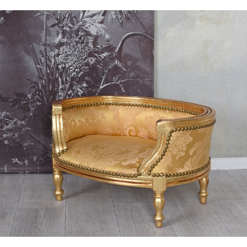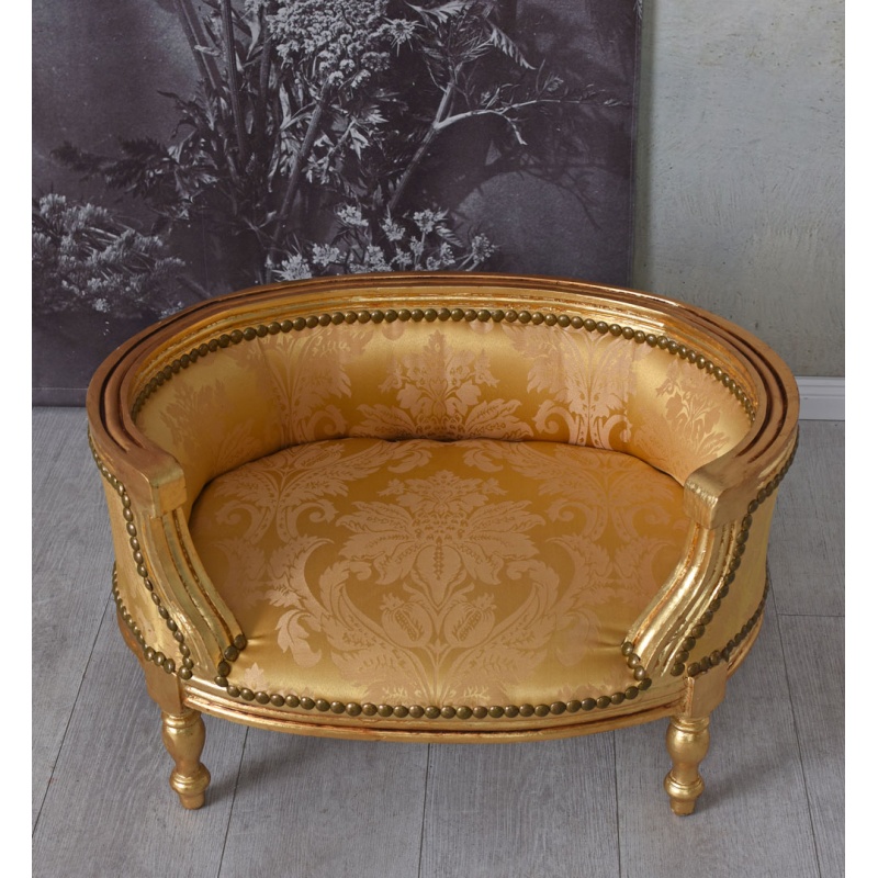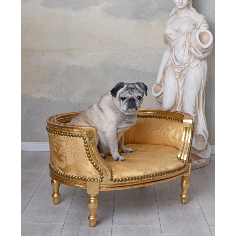 Canapea pentru caine din lemn auriu cu tapiterie aurie
