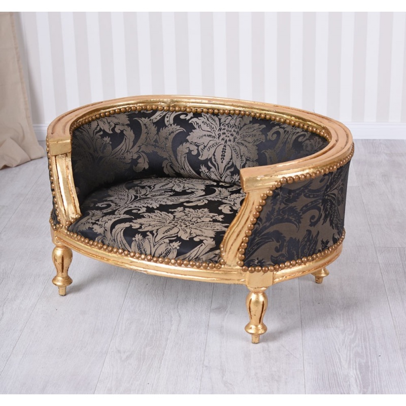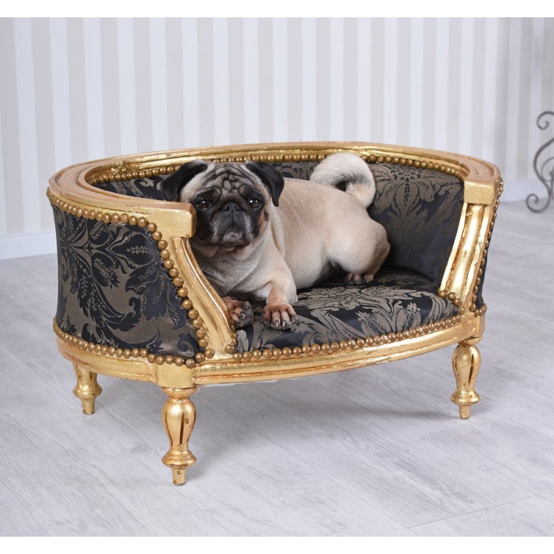 O frumoasa canapea din lemn masiv auriu cu tapiterie din matase neagra, o piesa frumoasa pentru un caine deosebit.
