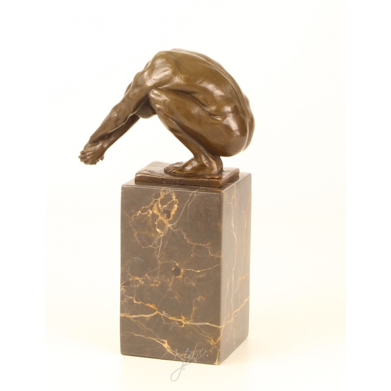 O interesanta statueta din bronz pe un soclu din marmura, ilustrand un scufundator.