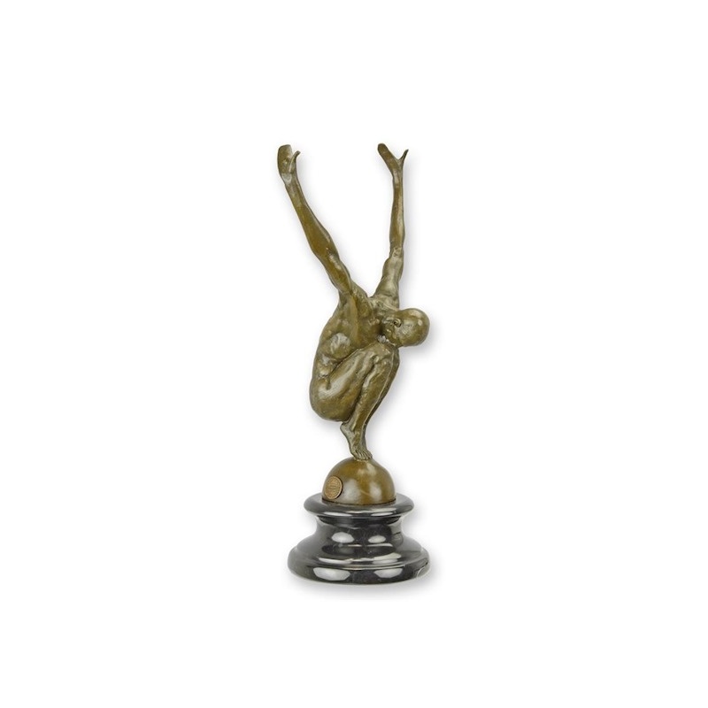 O superba statueta din bronz masiv pe un soclu din marmura, ilustrand un barbat nud care se pregateste de inot.