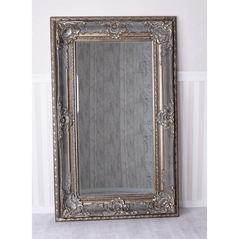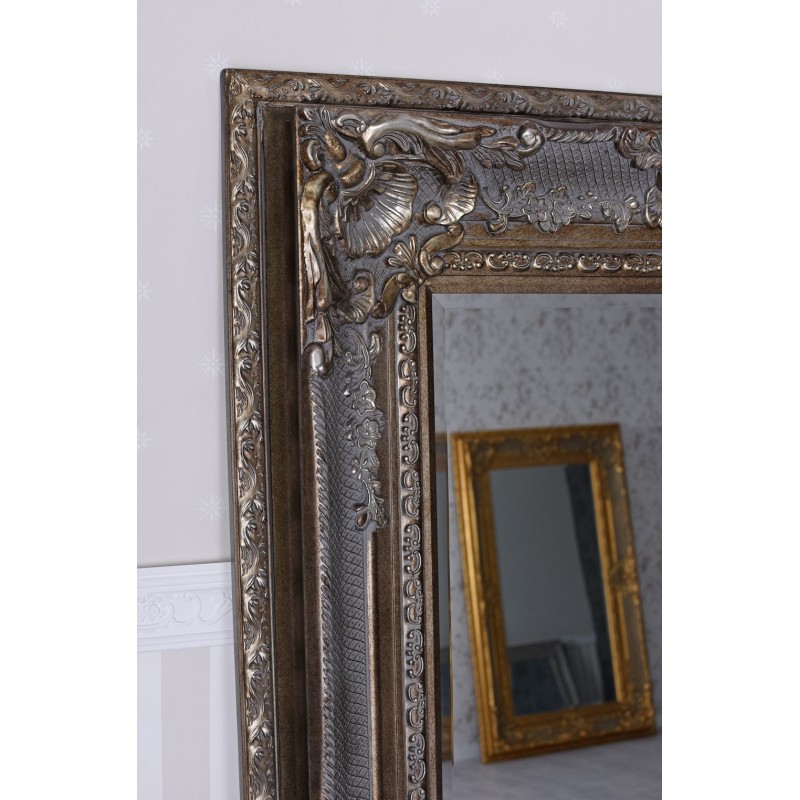 O oglinda baroc mare cu rama argintie cu diverse decoratiuni, o piesa clasica,cu o forma deosebita, realizata integral manual, din materiale de calitate,potrivita ca decor sau pentru a fi facuta cadou.