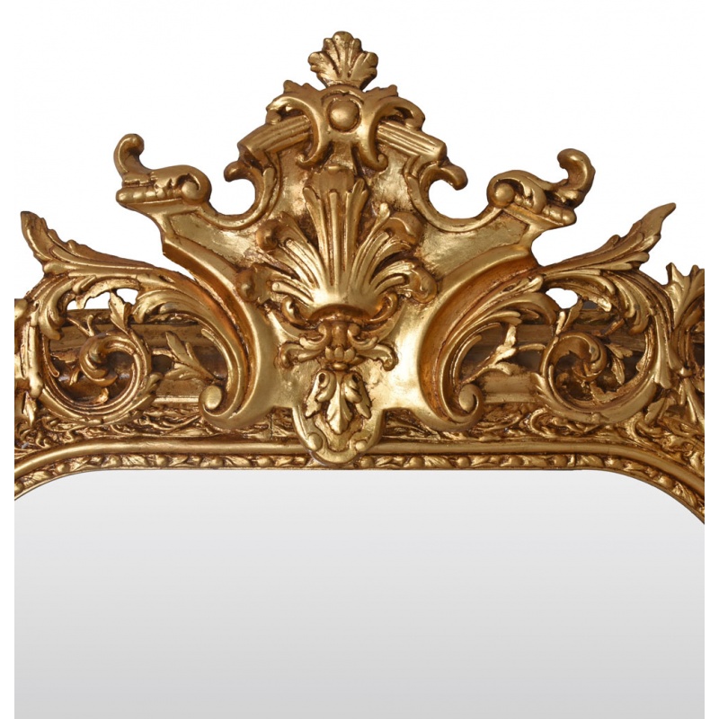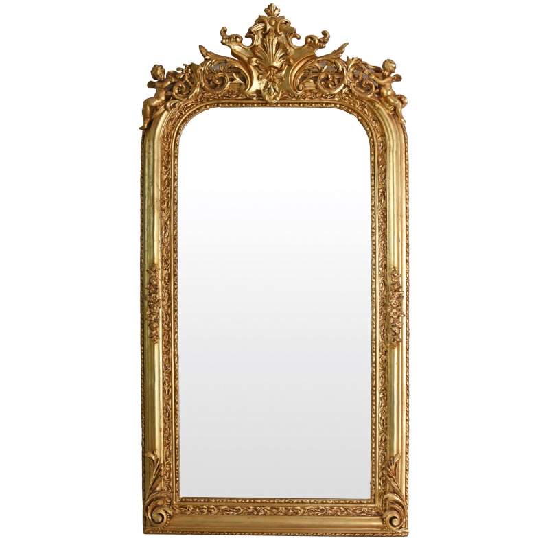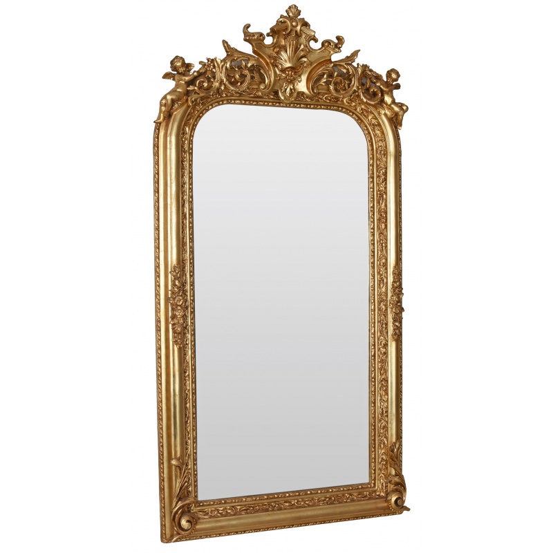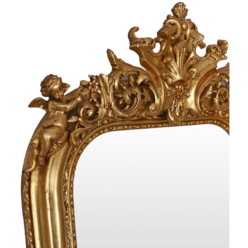 O impunatoare oglinda Rococo cu o rama aurie si decoratiuni in relief cu ingerasi.
