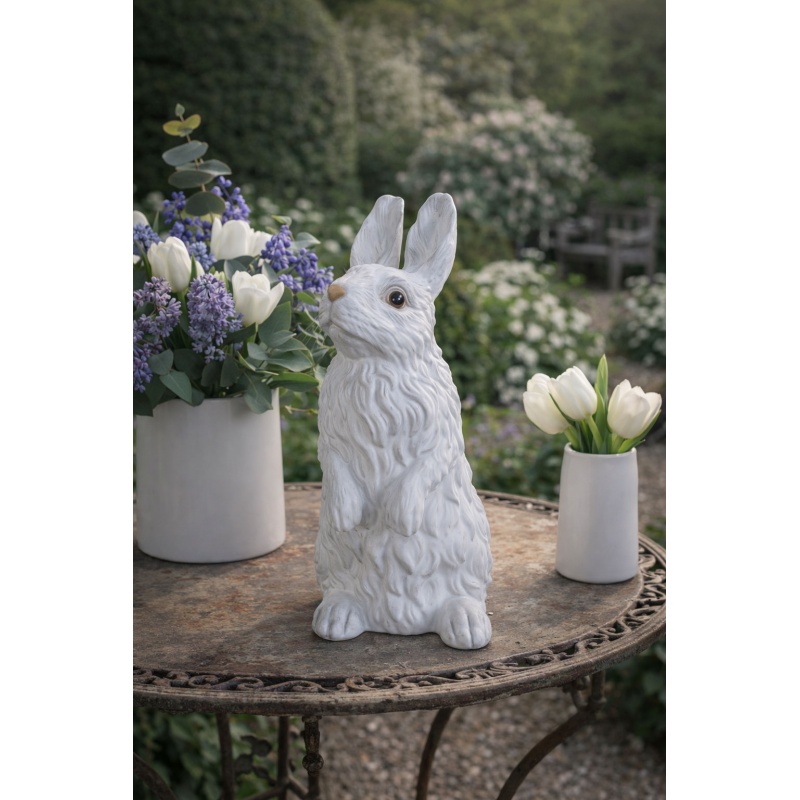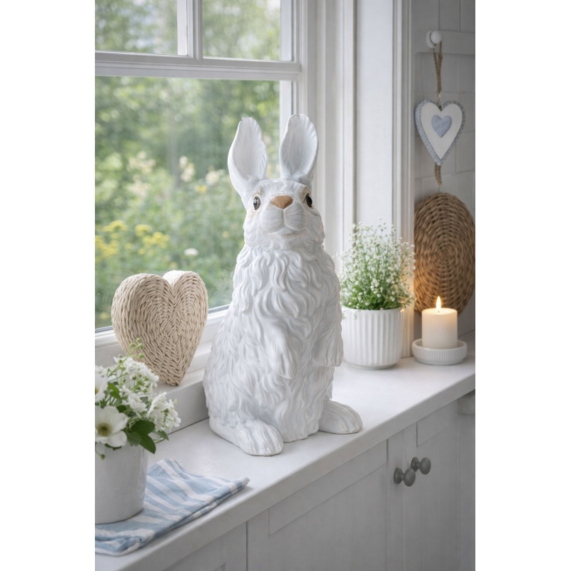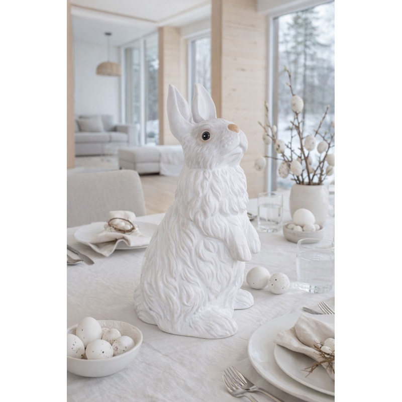 O frumoasa figurina clasica, realizata din portelan alb si pictata manual, care ilustreaza un iepuras, simbol al Sarbatorilor Pascale.