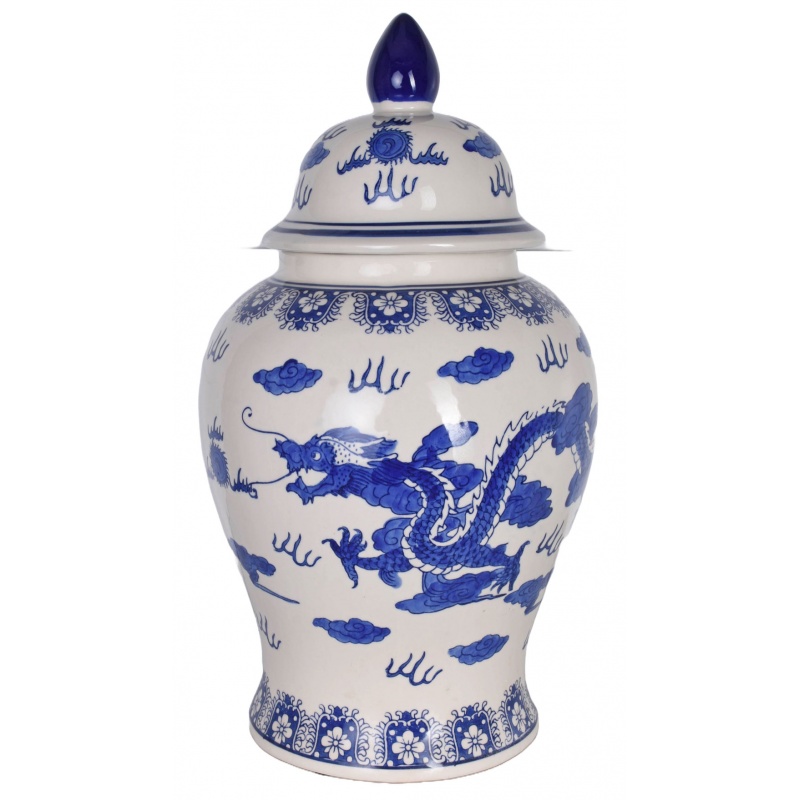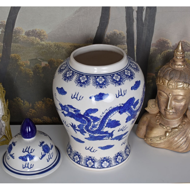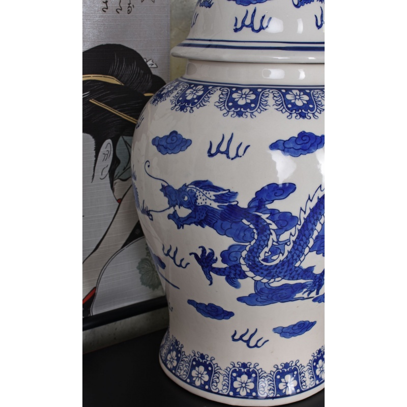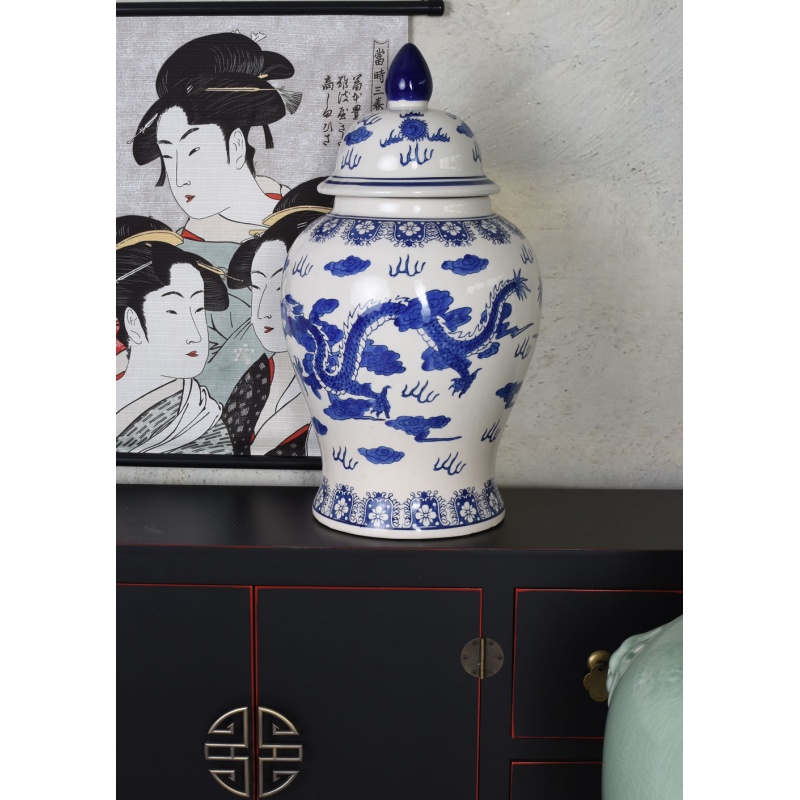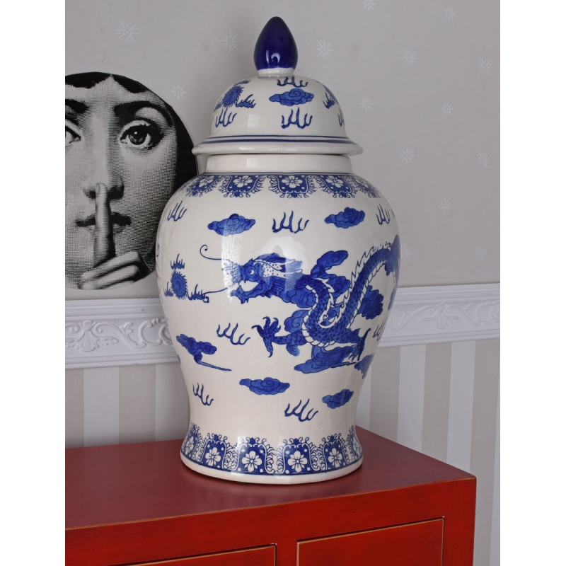 O amfora maginifica din portelan in stil chinoiserie, decorată cu o pictură detaliată a dragonului, un tribut adus tradiției artistice din Orientul Îndepărtat.