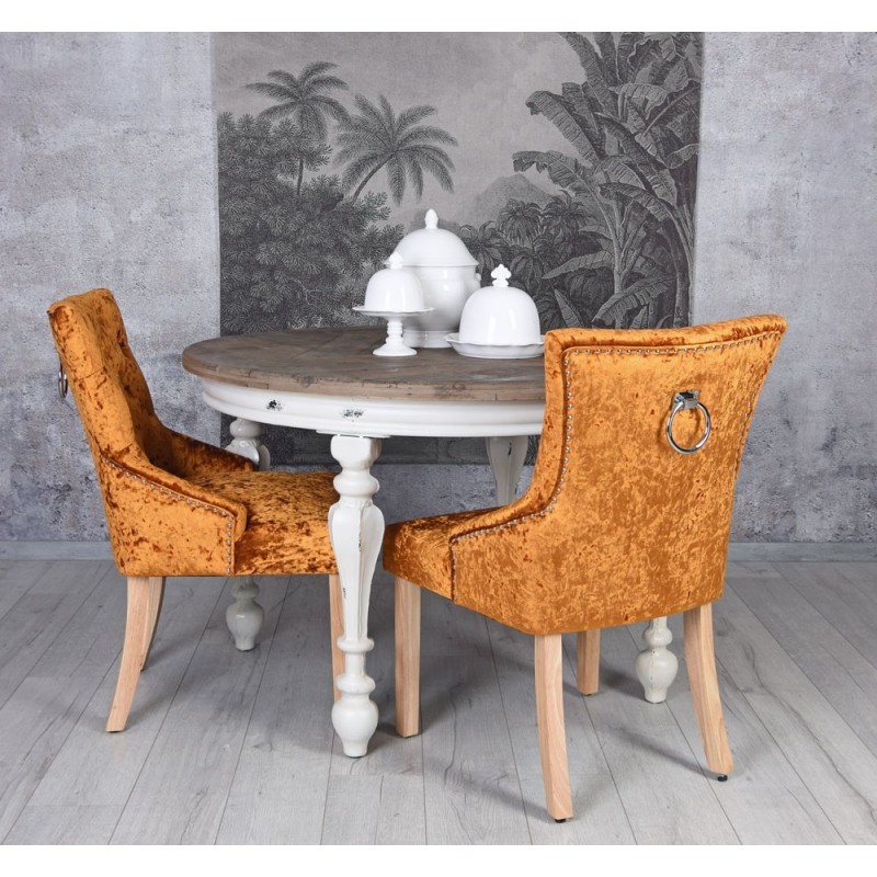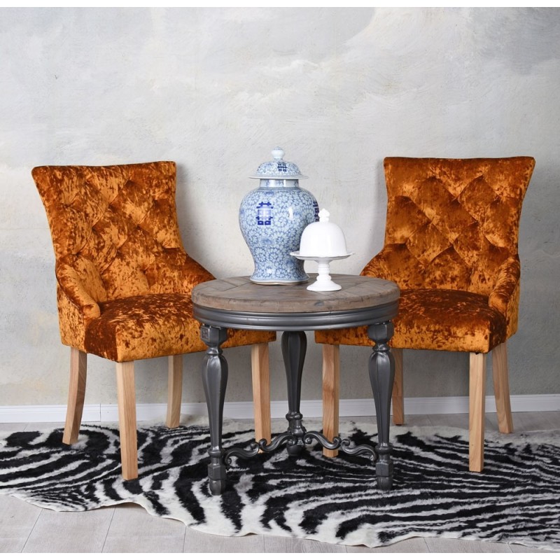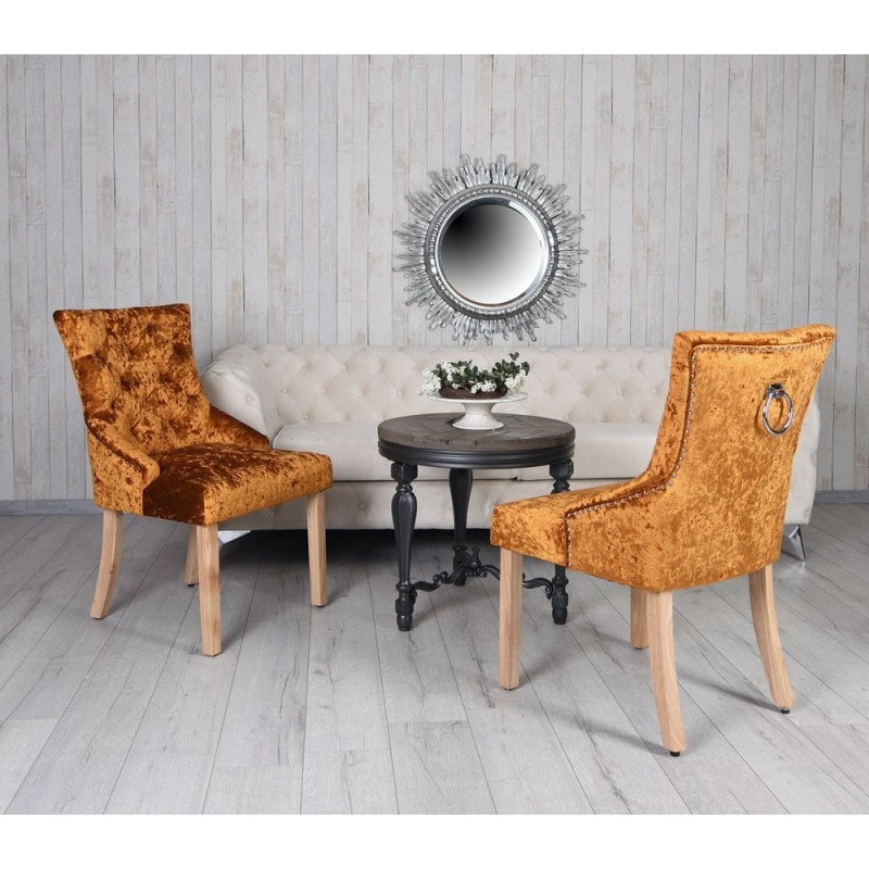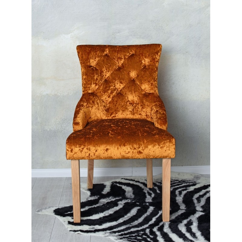 Un scaun din lemn masiv cu picioare natur si tapiterie din catifea maro deschis, cu tinte si decoratiuni metalice.Scaunul este o piesa moderna, lucrata integral manual, solida si fin cizelata. Scaunul poate fi folosit atat pentru zona de living, cat si pentru cea de dining, in functie de necesitati. Inaltime totala = 90 cm; Inaltime sezut = 47 cm; Latime = 55 cm; Adancime = 54 cm;