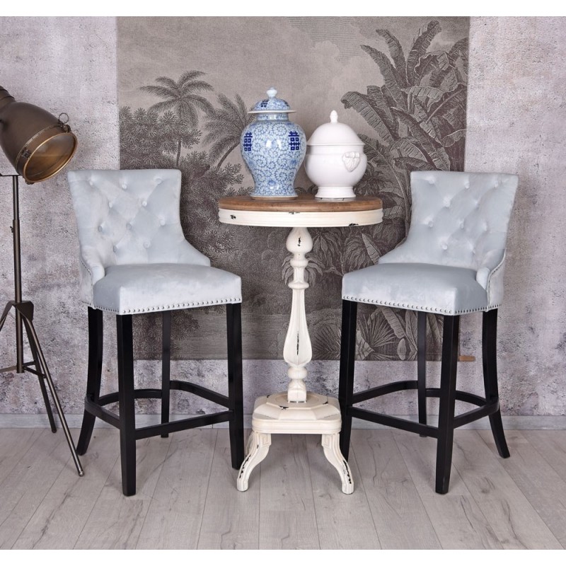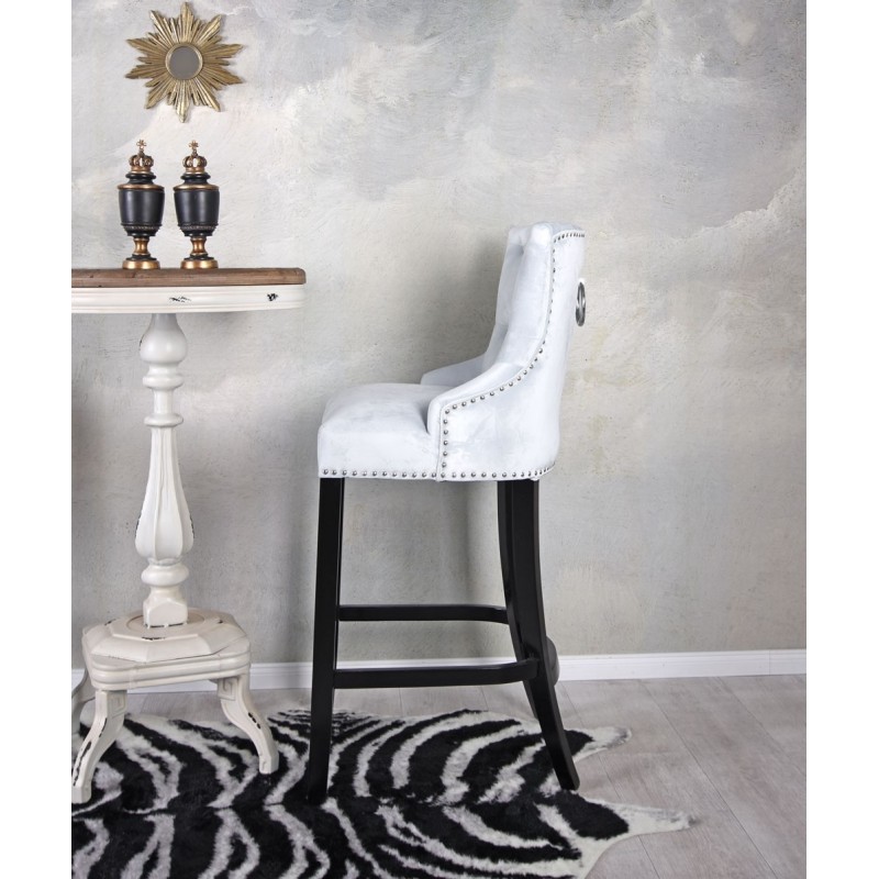 Un scaun de bar din lemn masiv cu picioare negre si tapiterie din catifea gri deschis, prevazut cu tinte si decoratiuni metalice. Scaunul este o piesa clasica, lucrata integral manual, solida si fin cizelata.Scaunul poate fi folosit atat pentru zona de living, cat si pentru cea de dining, in functie de necesitati. Inaltime totala = 113 cm; Inaltime sezut = 80 cm; Latime = 50 cm; Adancime = 40 cm;
