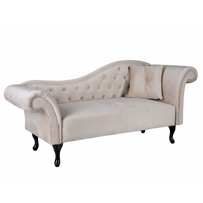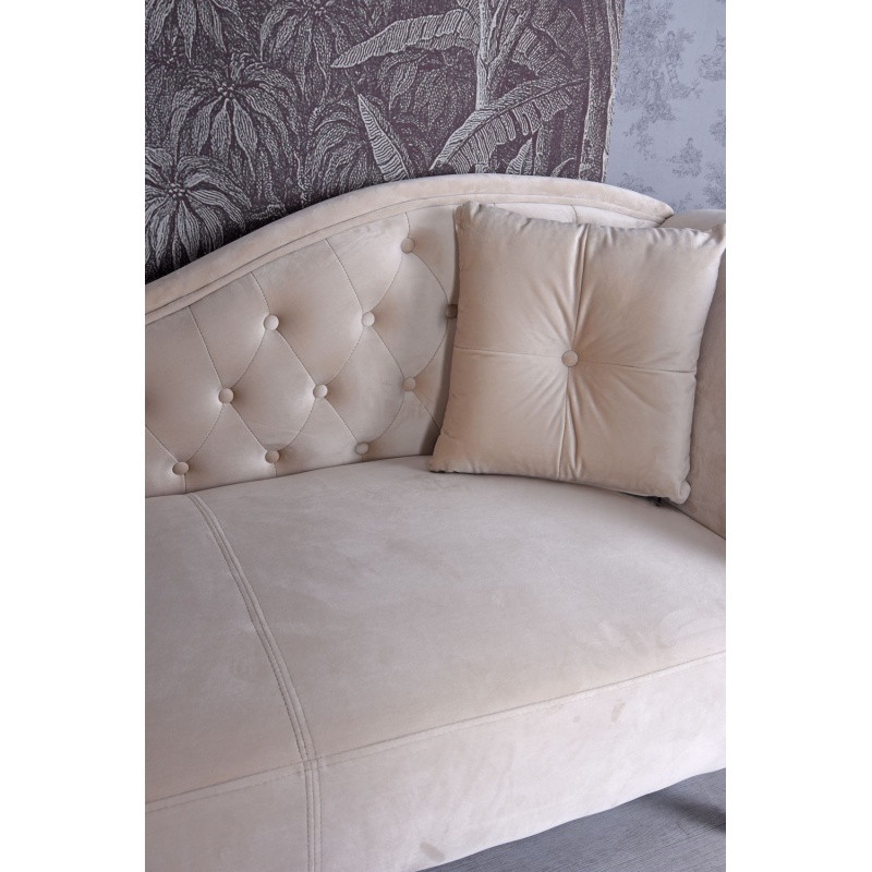 O sofa Chesterfield de inalta calitate, realizata din lemn masiv si tapiterie din catifea luxoasa bej.