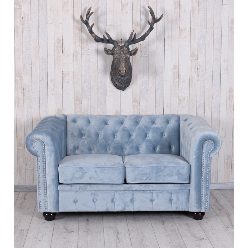O sofa Chesterfied de doua locuri din lemn masiv cu tapiterie albastru marin. Sofaua este o piesa deosebita, lucrata integral manual, fosrte solida si impunbatoare, potrivita pentru mobilarea unui living sau dormitor.