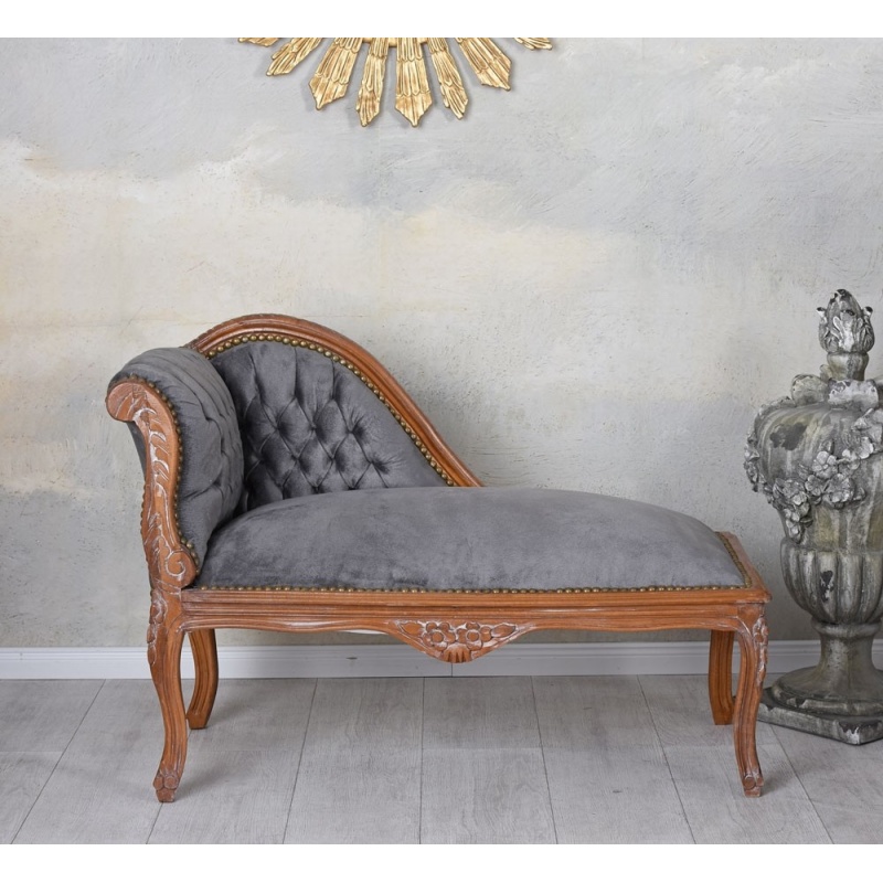 O sofa din lemn mahon cu tapiterie din catifea gri soarece.