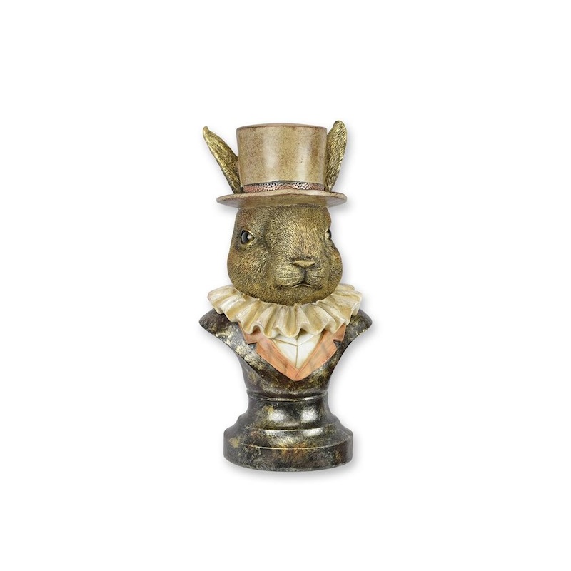 O statueta din rasini reprezentand un iepure elegant, purtand o tinuta stilizata ce imbina detalii fine cu un aer jucaus.