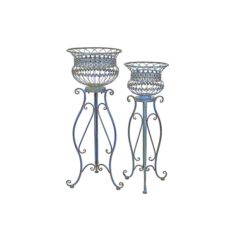 Un set de doua jardiniere amplasate pe un stand, din fier forjat antik blue.