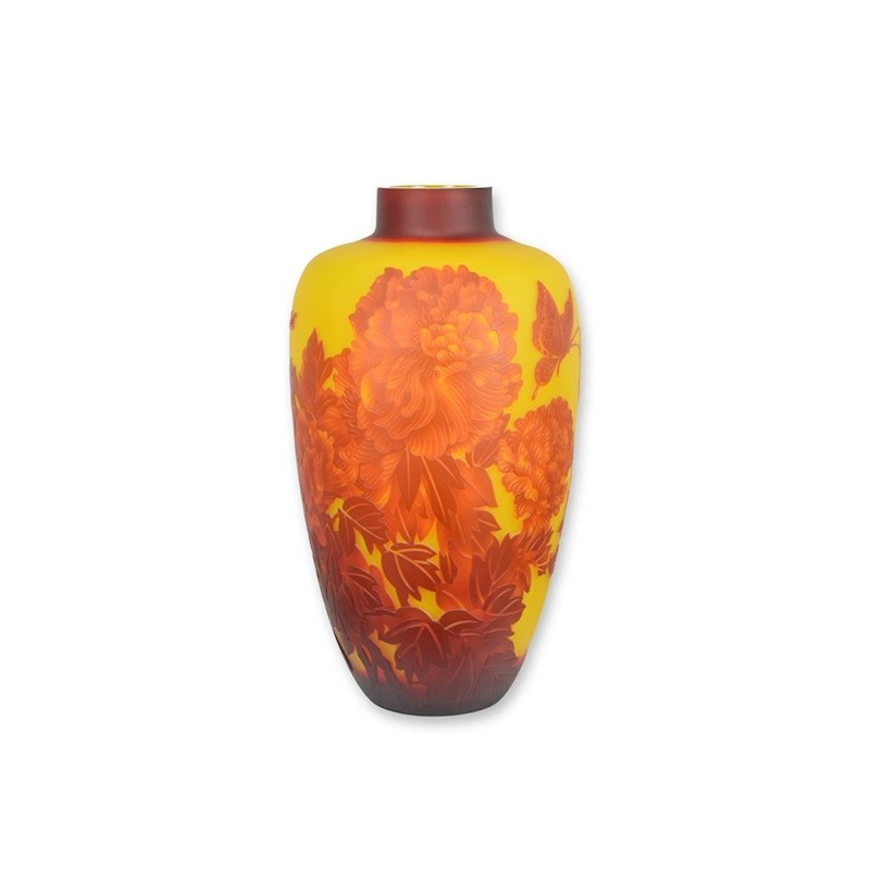 O vaza din sticla Cameo decorata cu flori de dalie în nuanțe de oranj si galben, cu detaliile petalelor realizate prin tehnici de gravare care evidențiază texturile și umbrele.