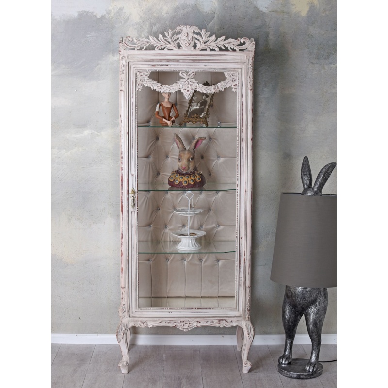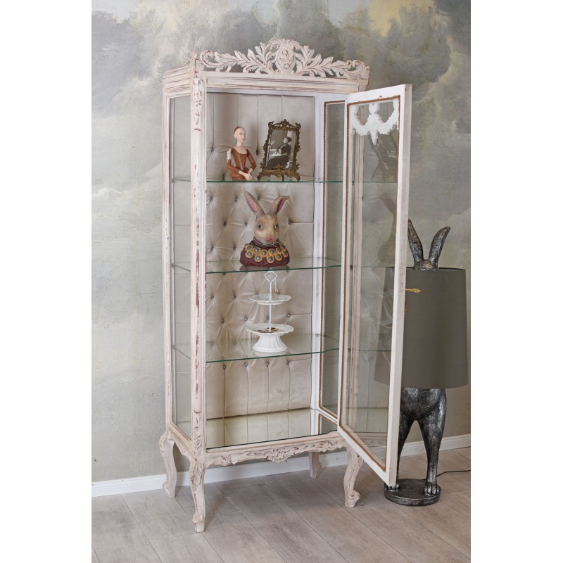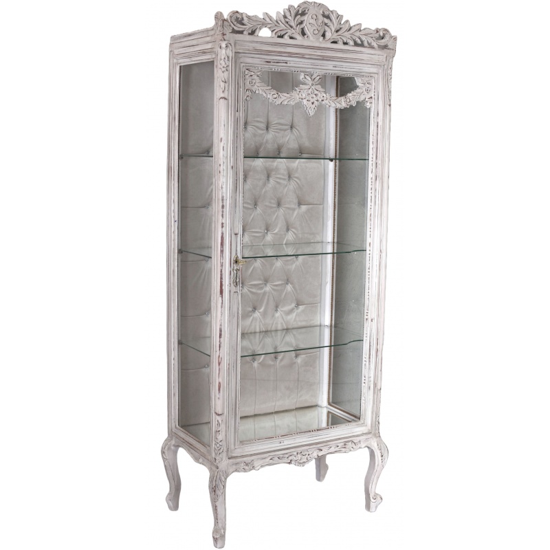 O vitrina baroc din lemn masiv alb, cu interior capitonat cu matase si fitinguri din alama masiva vopsite in alb.