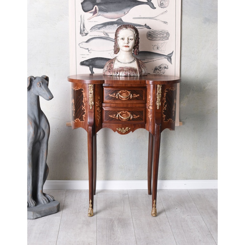 O comoda baroc din lemn masiv furniruit cu diferite esente pretioase, accesorii din alama si doua sertare spatioase.