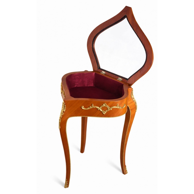 O vitrina pentru bijuterii din lemn masiv furniruit, sub forma de inima, cu un capac articulat din sticla, captusita cu o perna fina de catifea.