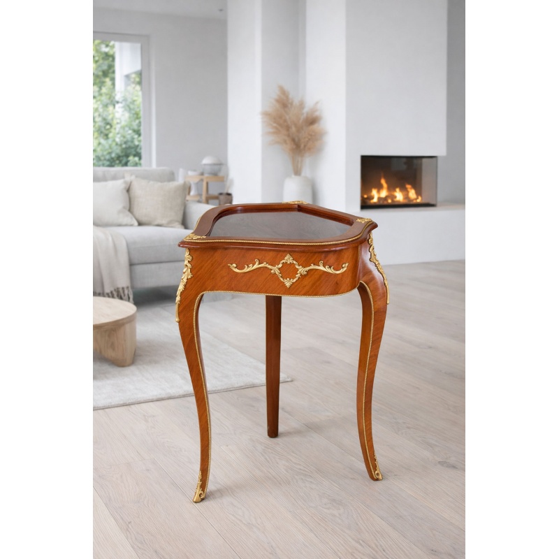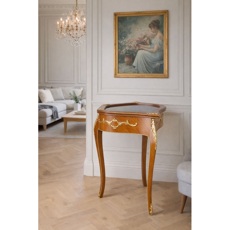 Realizata din lemn masiv si atent rafinata, cu sculpturi ornamentate si aplicatii nobile din alama, aceasta vitrina plina de farmec intruchipeaza stilul baroc opulent al secolelor trecute.