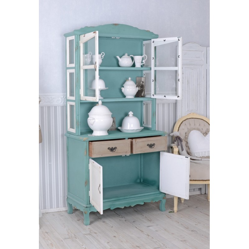 Vitrina turn din lemn verde antichizat cu alb si maro